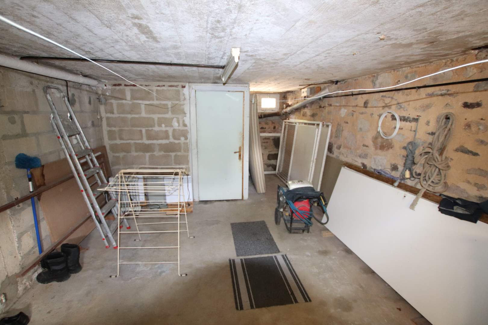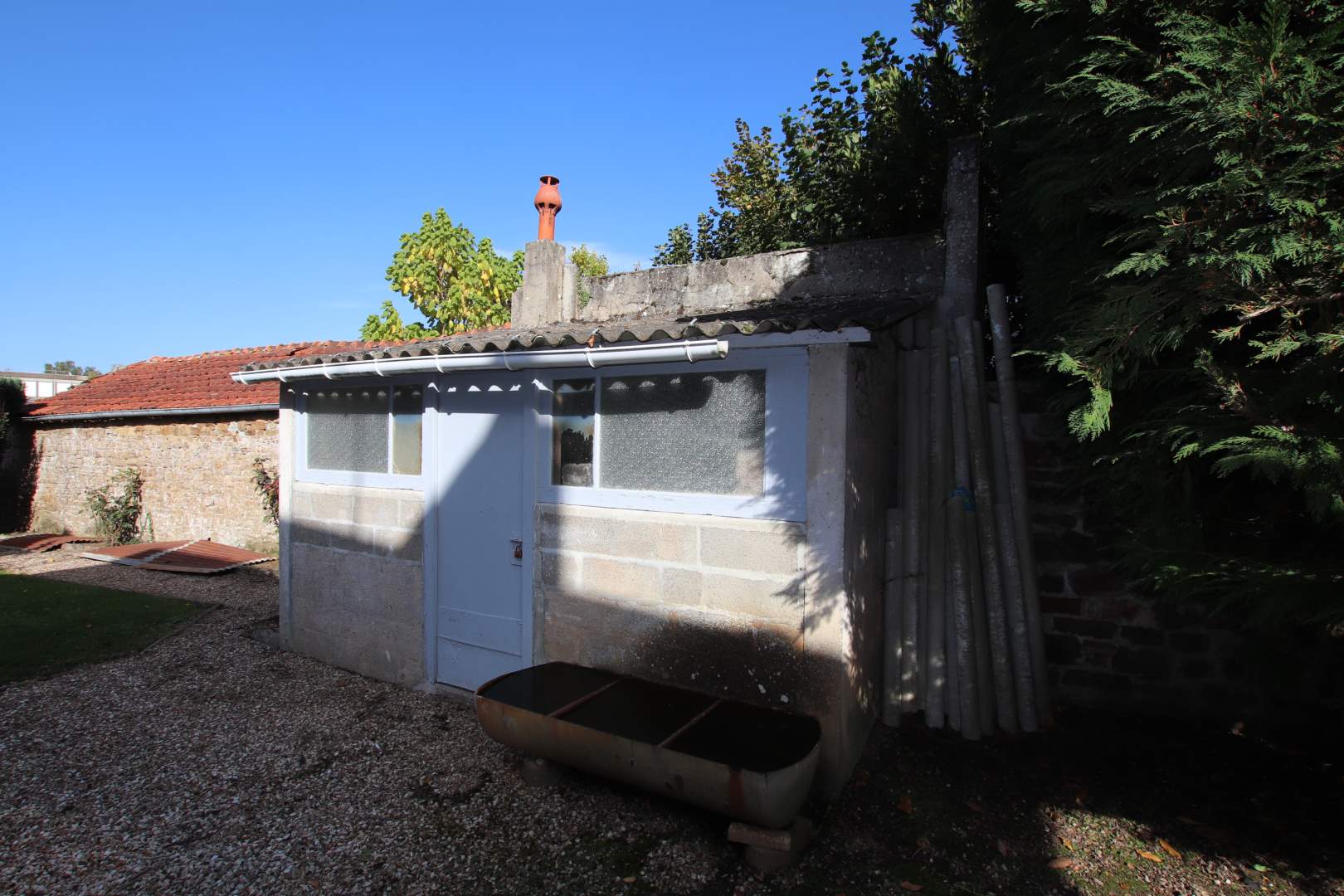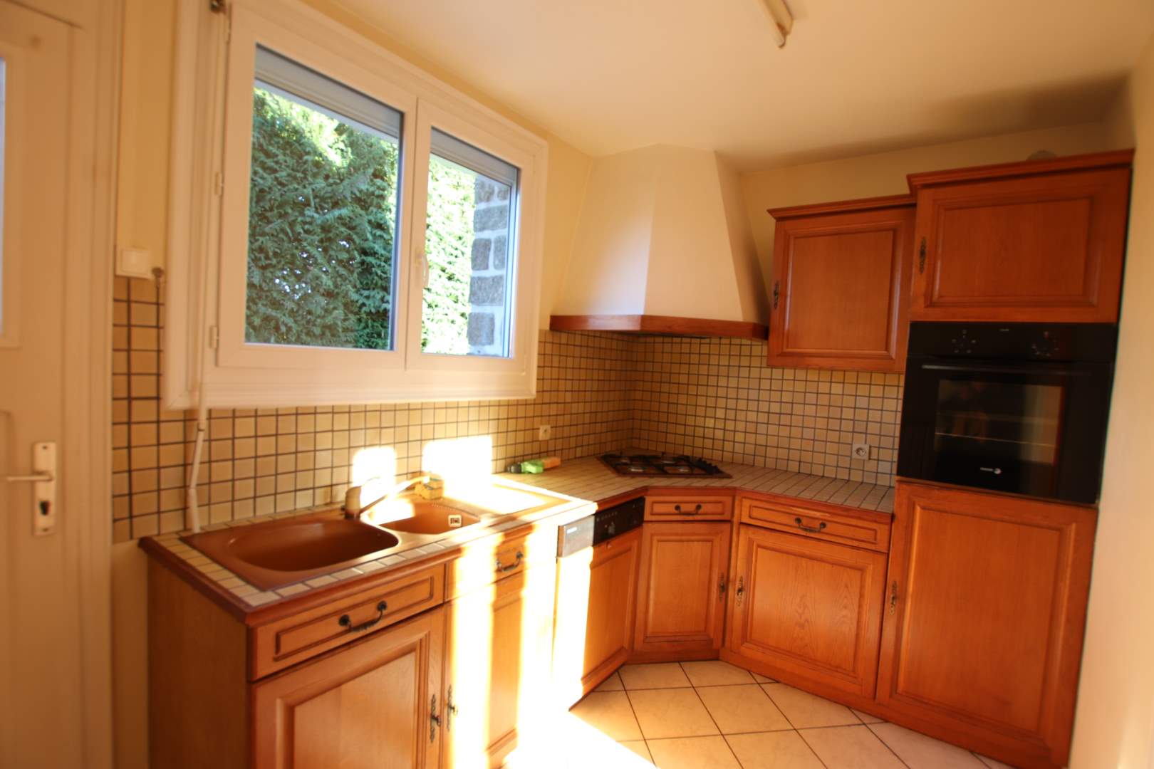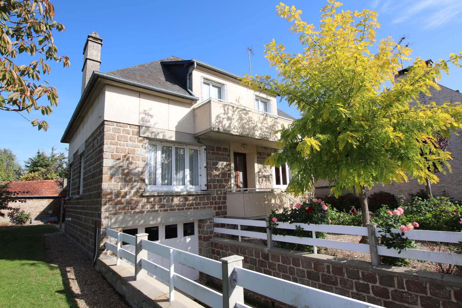 Maison en centre ville, proche des commerces, comprenant au rez-de-chaussée : entrée, séjour/salon, salle de douche, WC, cuisine aménagée avec coin repas, à l'étage, trois chambres, dont 2 donnant sur un balcon, grande salle de bains (baignoire, douche, lavabo), WC. Garage, cellier, cave. Terrain avec cabanon.
