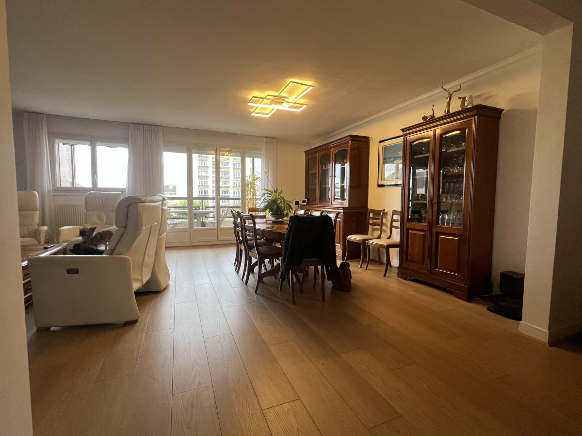 CAEN rive gauche - Résidence Jean Racine - dans résidence de bonne tenue avec ascenseur, beau 5 pièces de 119 m2, comprenant séjour salon 37 m2, cuisine aménagée, 3 chambres, 2 salles d’eau, wc. Cave et garage. Balcon. Charges collectives gaz. (Bientôt chauffage urbain). Très bon état général. DPE : C