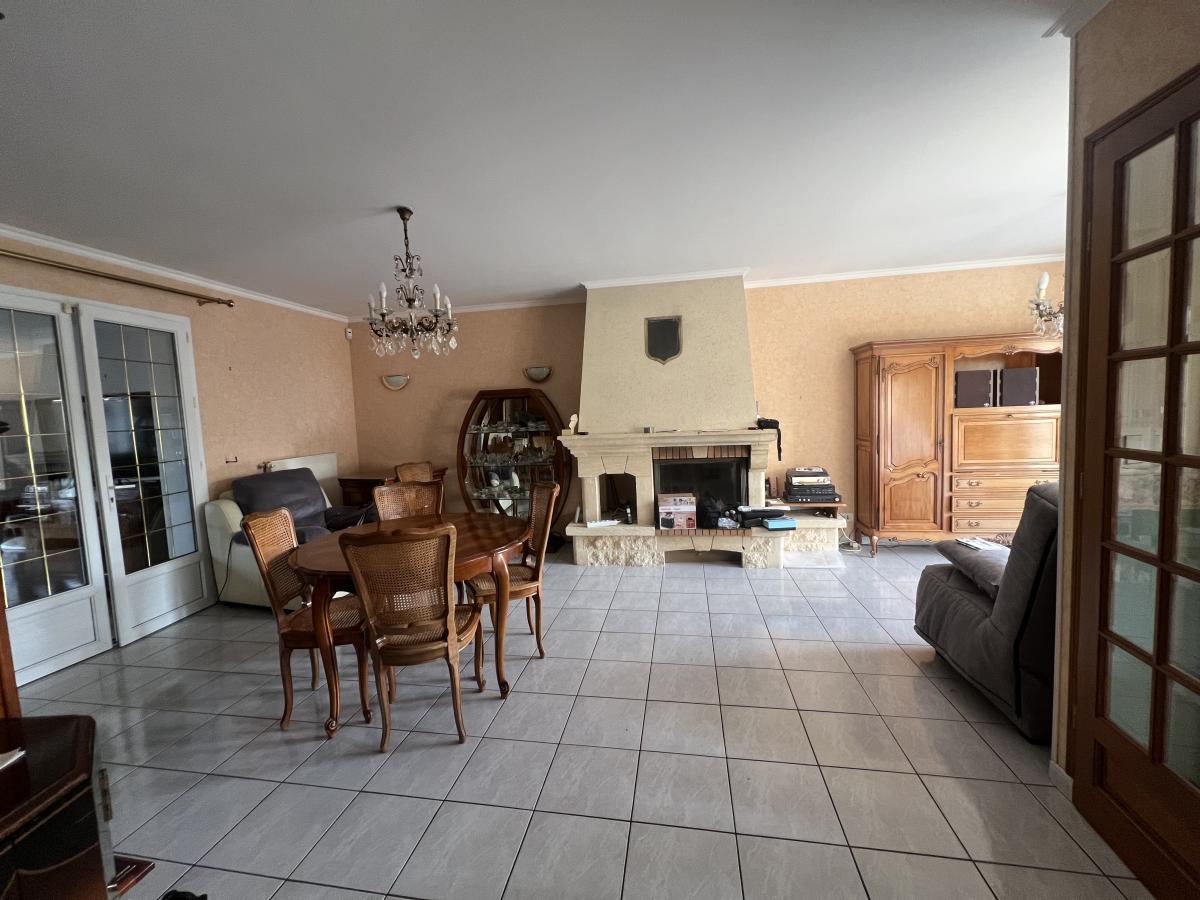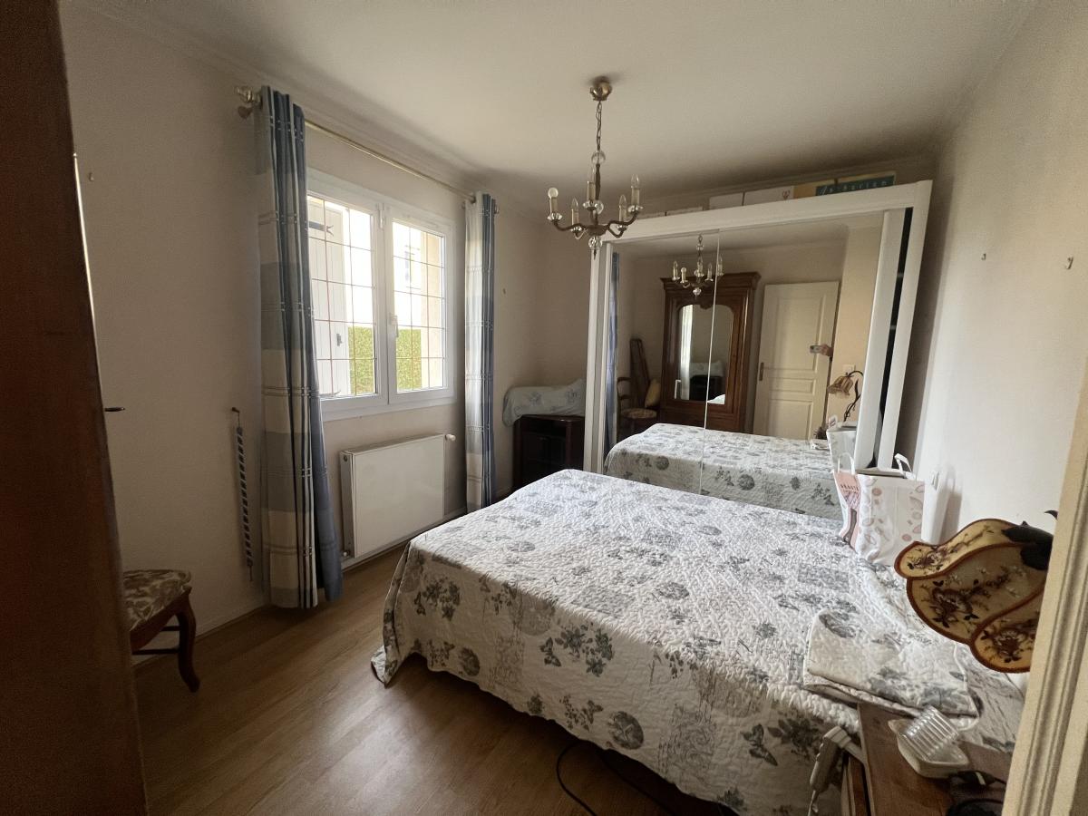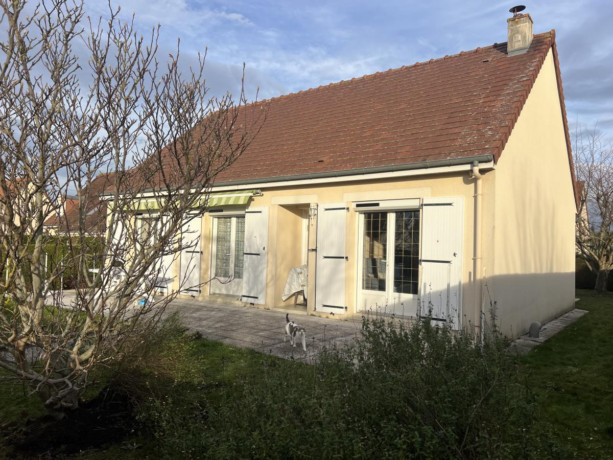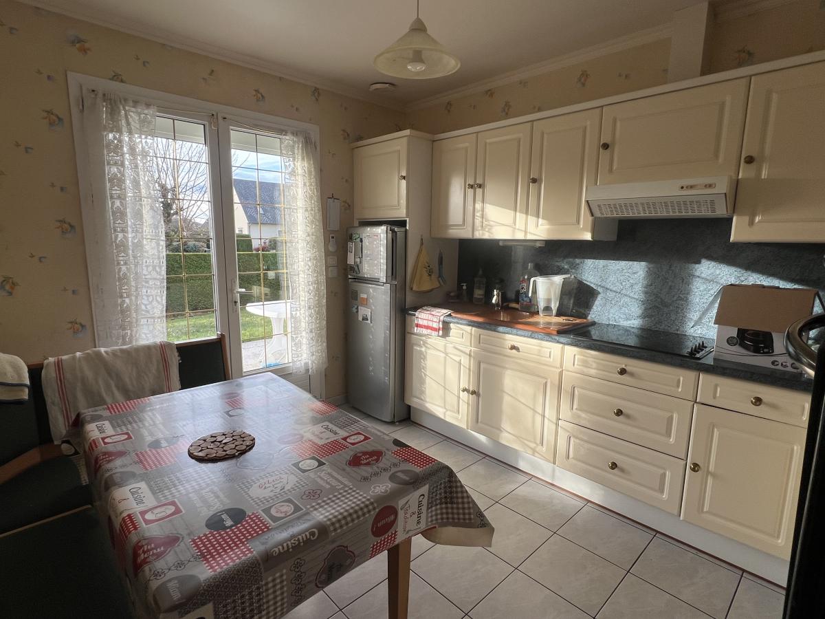 OUEST DE CAEN - CARPIQUET - bus de ville - Maison individuelle 1998 de plain pied sur sous sol complet comprenant entrée, séjour salon avec cheminée, cuisine aménagée, 3 chambres, salle d'eau récente, wc avec lave mains, dégagement. Chauffage gaz. Fenêtres PVC avec volets roulants électrique. Terrain clos de 610 m2 avec cabanon. DPE : D