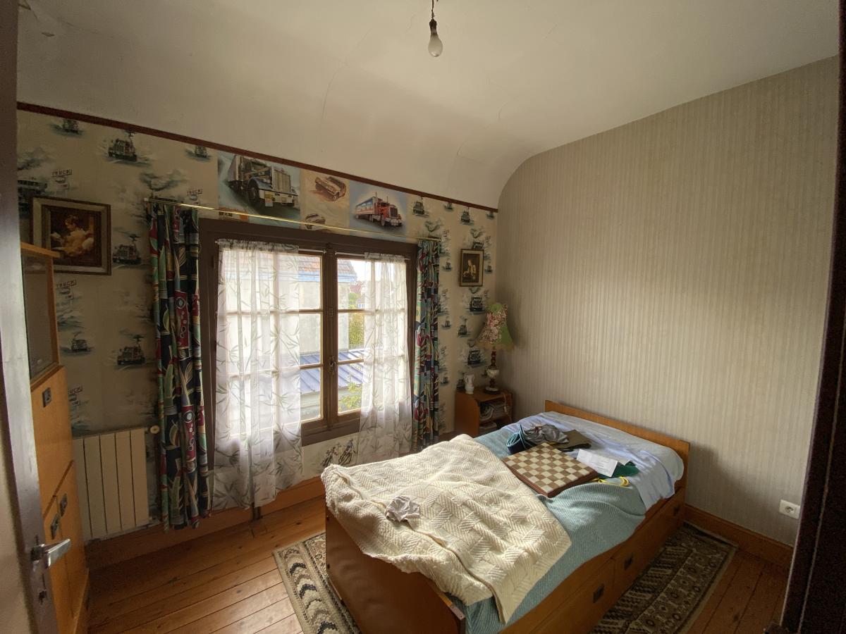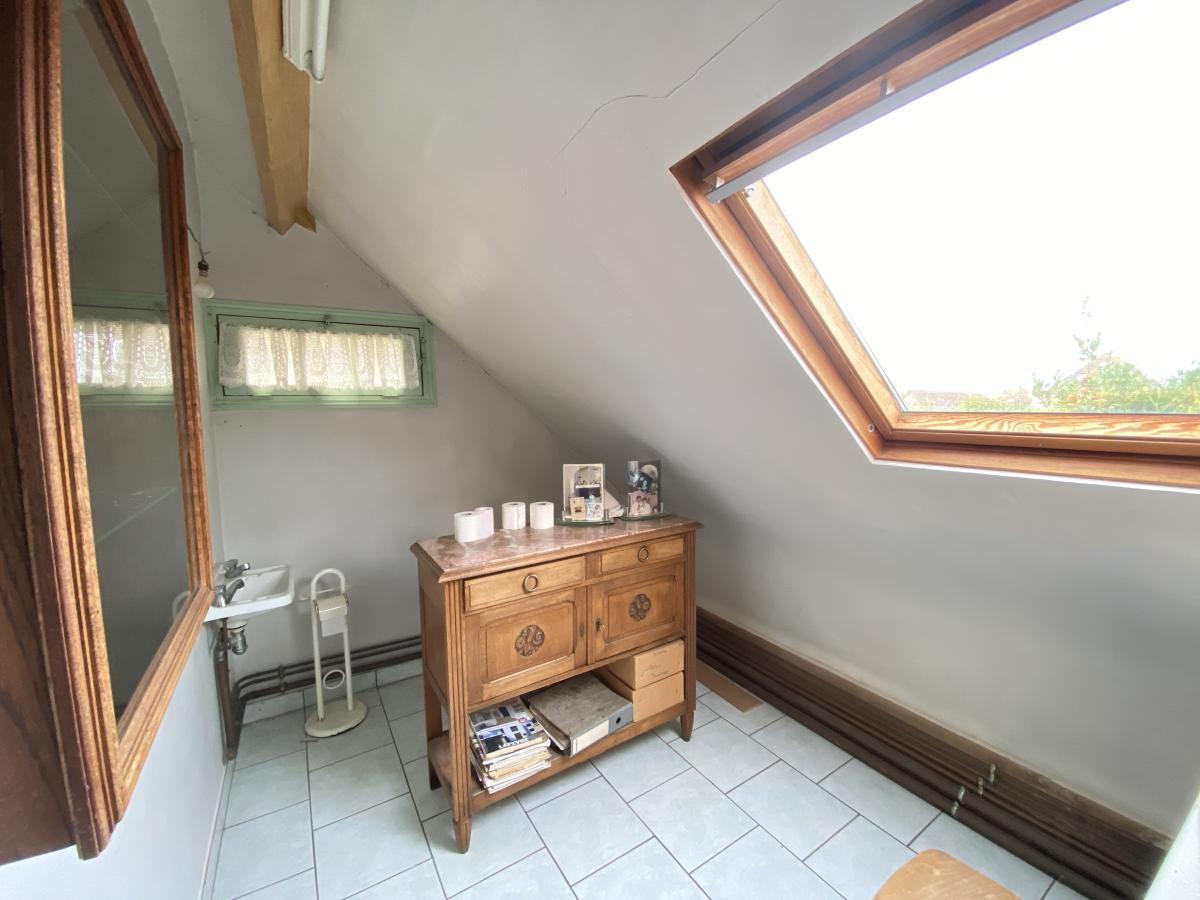 A l'ETAGE : PALIER, DEUX CHAMBRES DONT UNE AVEC TERRASSE, UNE PIECE AVEUGLE, SALLE DE BAINS, DEGAGEMENT ET WC.