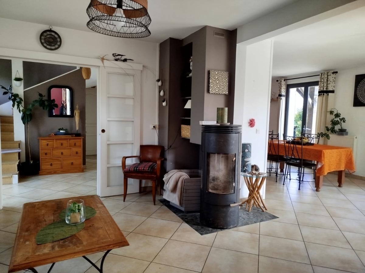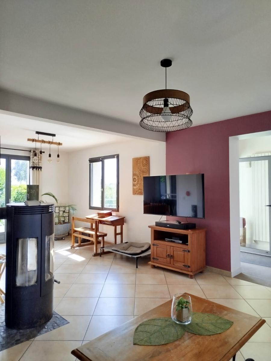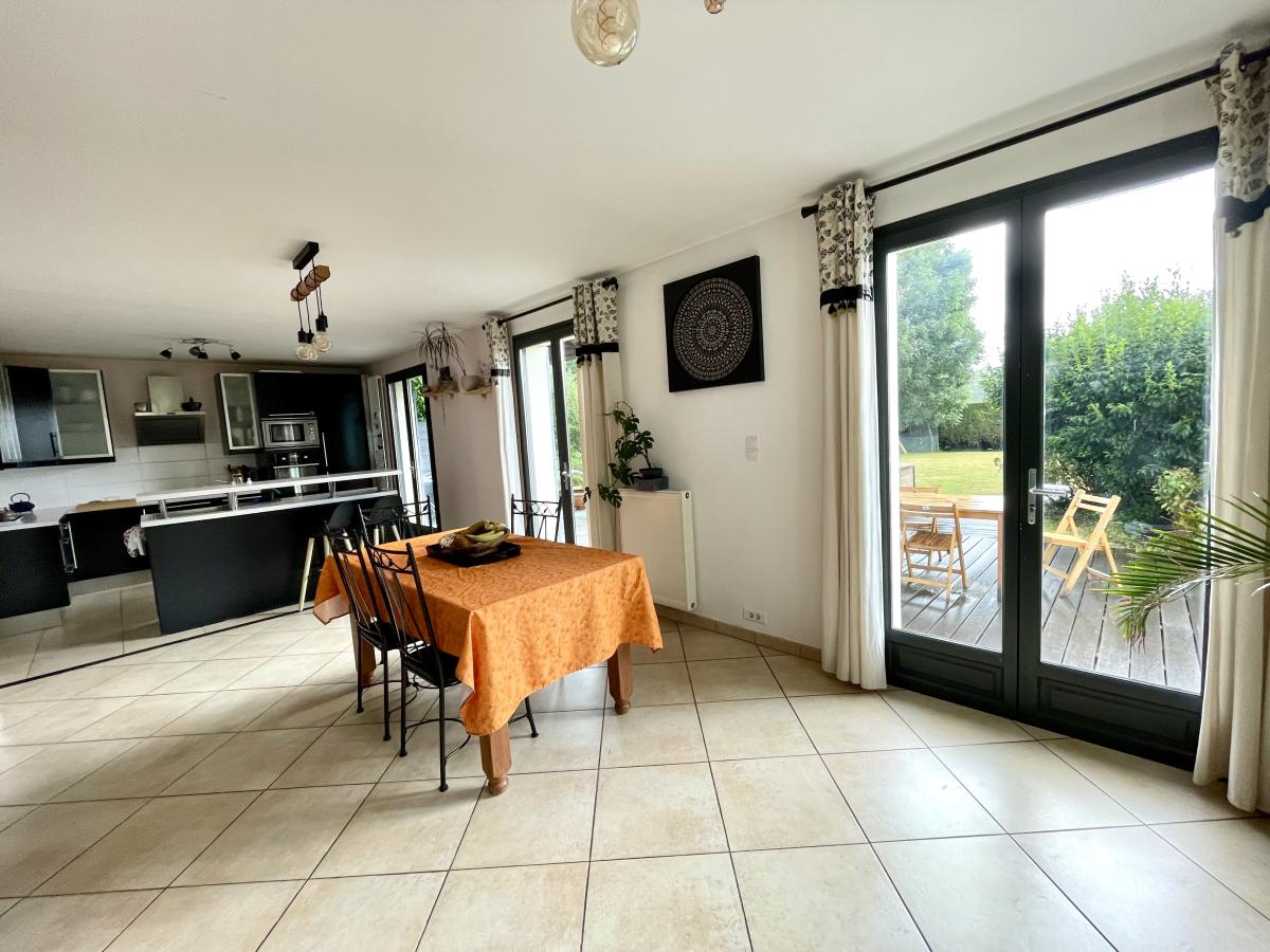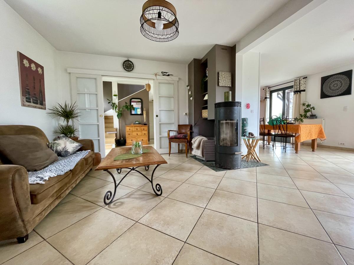 Dès l’entrée, vous serez séduit par un hall d’accueil avec placards qui mène à un vaste séjour/salon de 40 m², chaleureux et lumineux, agrémenté d’un poêle à bois. La cuisine A/E ouverte sur la salle à manger, forme un bel espace de vie convivial.