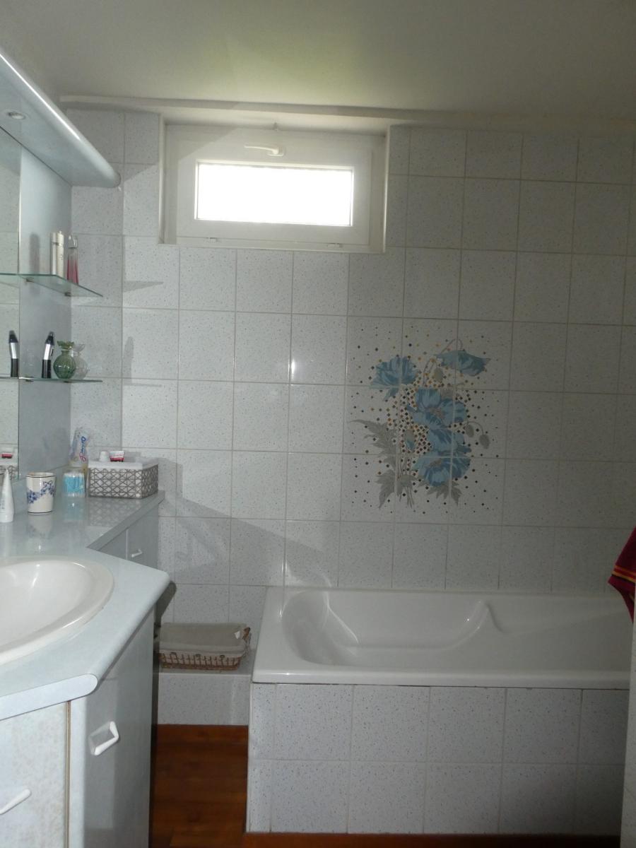 Au premier étage un palier desservant trois chambres dont deux en enfilade avec possibilité de faire un accès indépendant , une salle de bains ( Baignoire et douche) , wc indépendant et grenier aménageable .