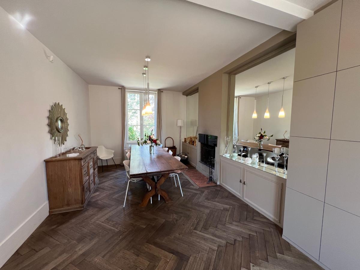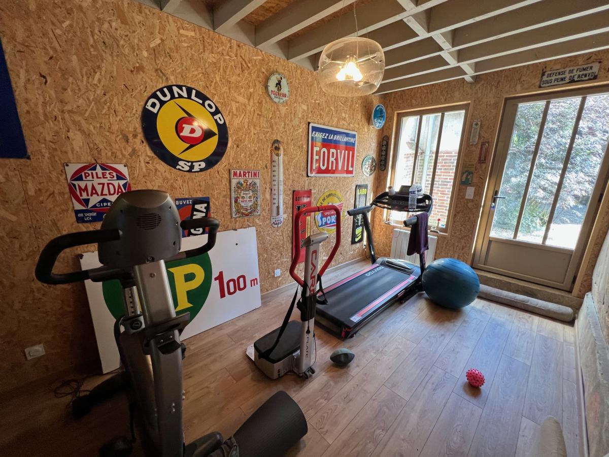 - Au rez-de-chaussée ; Entrée, salle à manger avec cheminée ouverte, salon avec cheminée, autre salon avec poêle à bois et bureau, cuisine aménagée et équipée, couloir desservant une suite parentale composée d'une grande chambre avec salle d'eau et wc et dressing, salle de sport