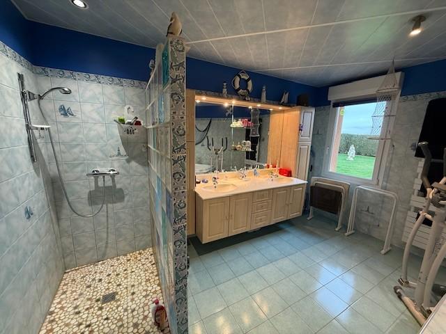 Entrée, cuisine aménagée et équipée ouverte sur salle-salon avec cheminée centrale double foyer, chauffage au sol pour partie et radiateurs électriques pour autre partie, wc indépendant, salle de bains avec baignoire et douche, buanderie dressing, 3 chambres.