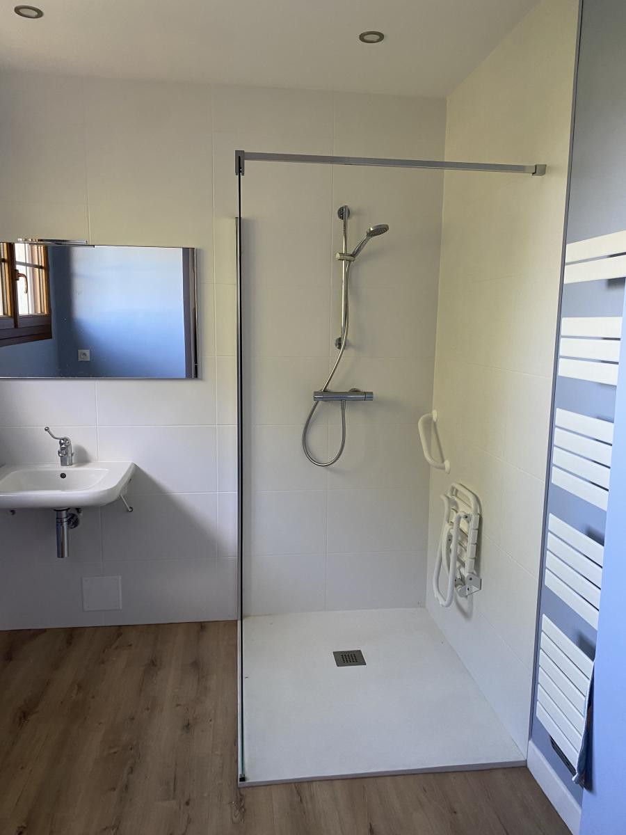- au rez-de-chaussée : une vaste entrée, une salle-salon parqueté avec cheminée, une grande cuisine aménagée, une chambre avec placard, une bibliothèque, une salle d'eau récente avec W.C.