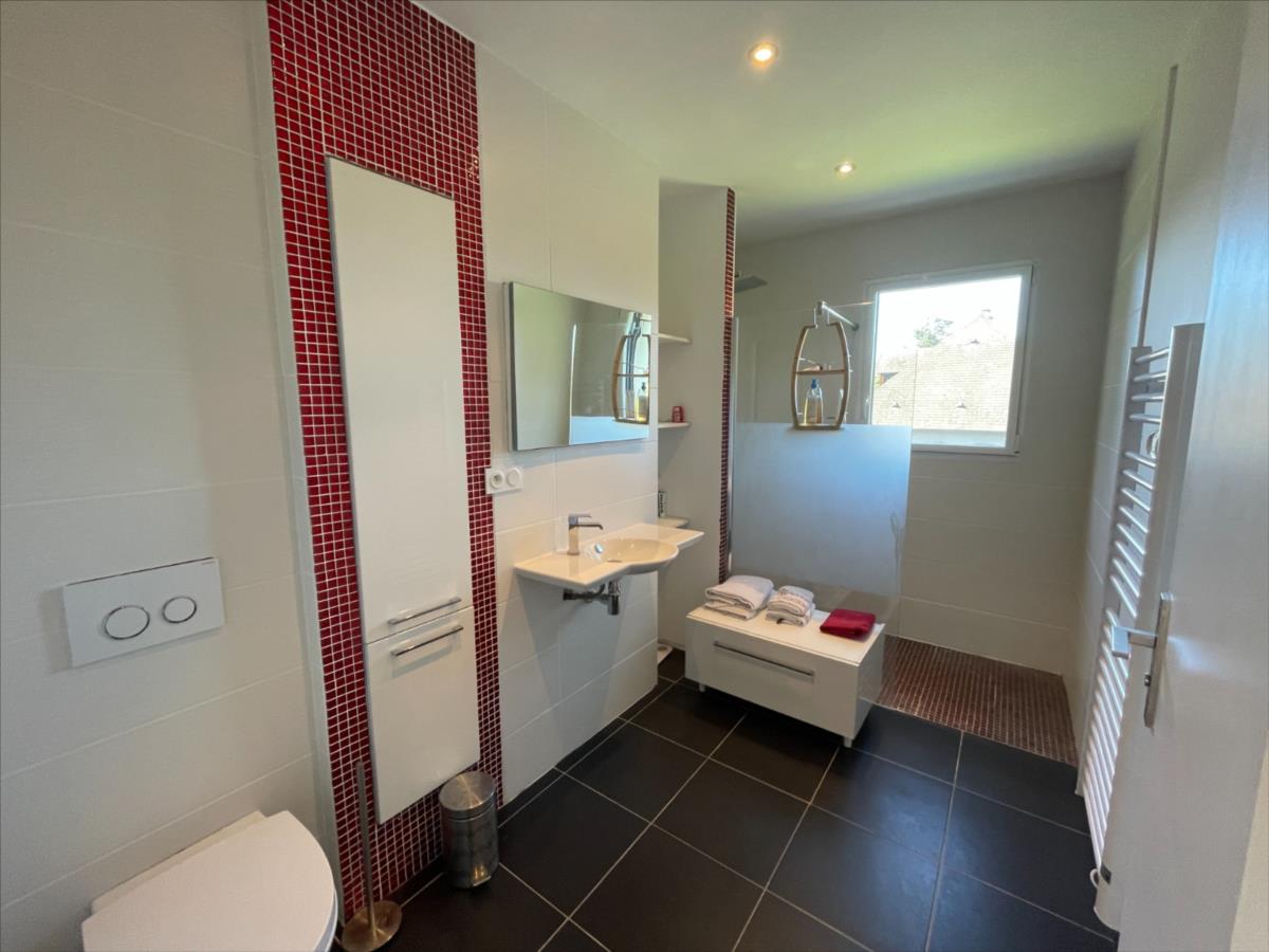 WC, placard, vaste séjour- salon 100m² avec cheminée et terrasse avec partie abritée,