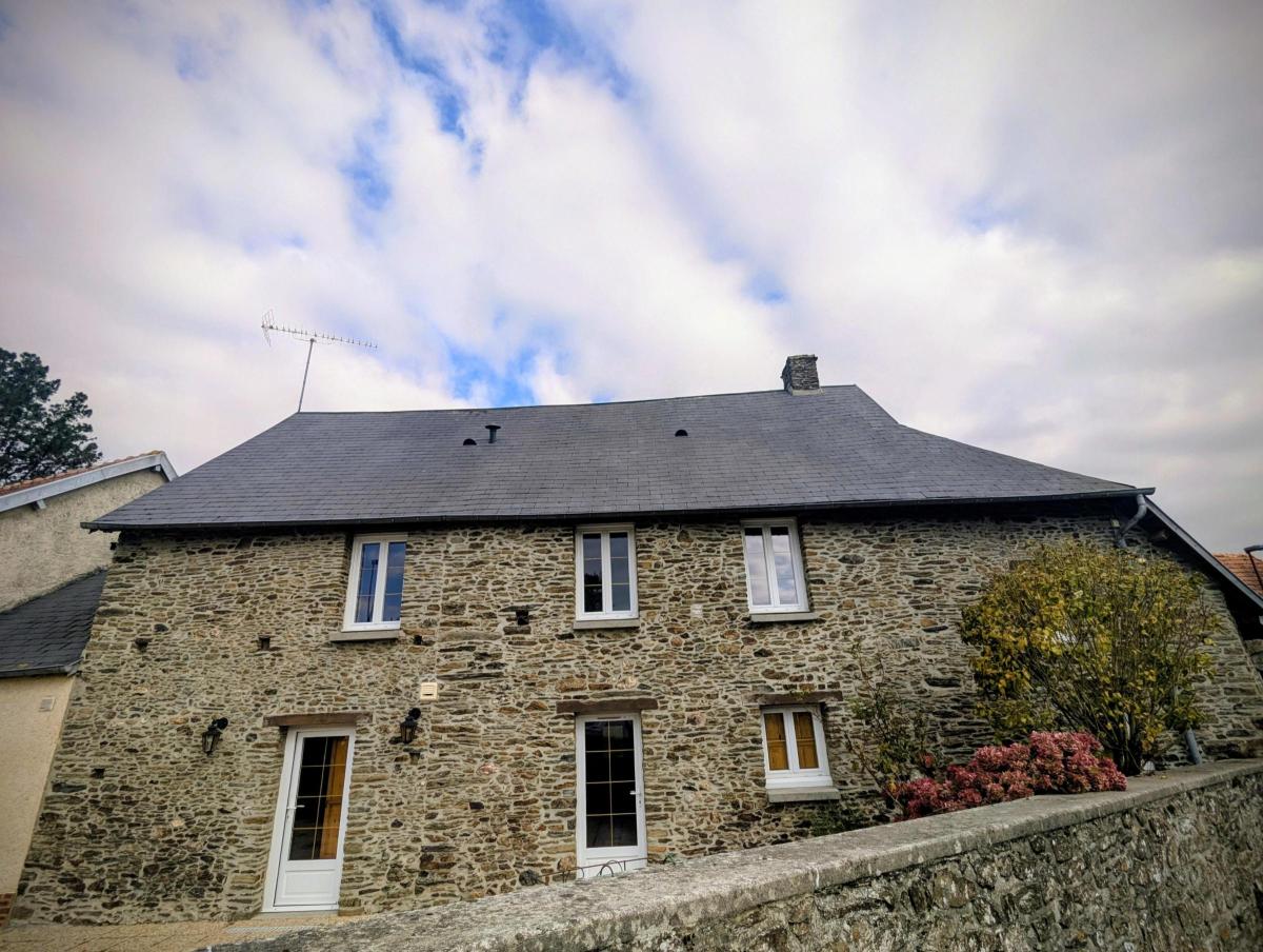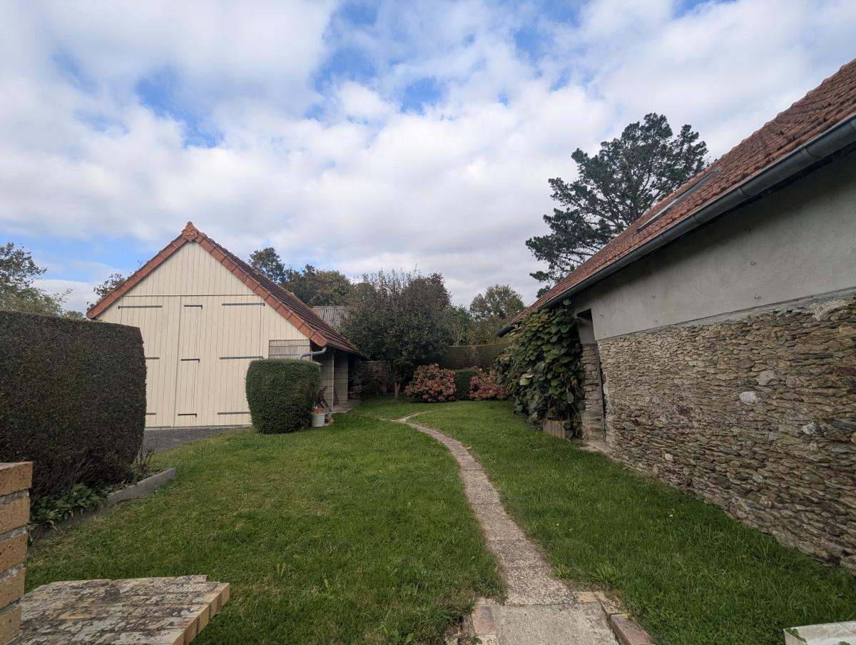 Maison dont la façade côté jardin est en pierre, située dans un environnement calme.
