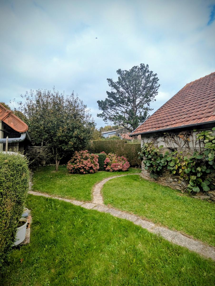 Terrain clos, arboré et aménagé à l’arrière de la maison.