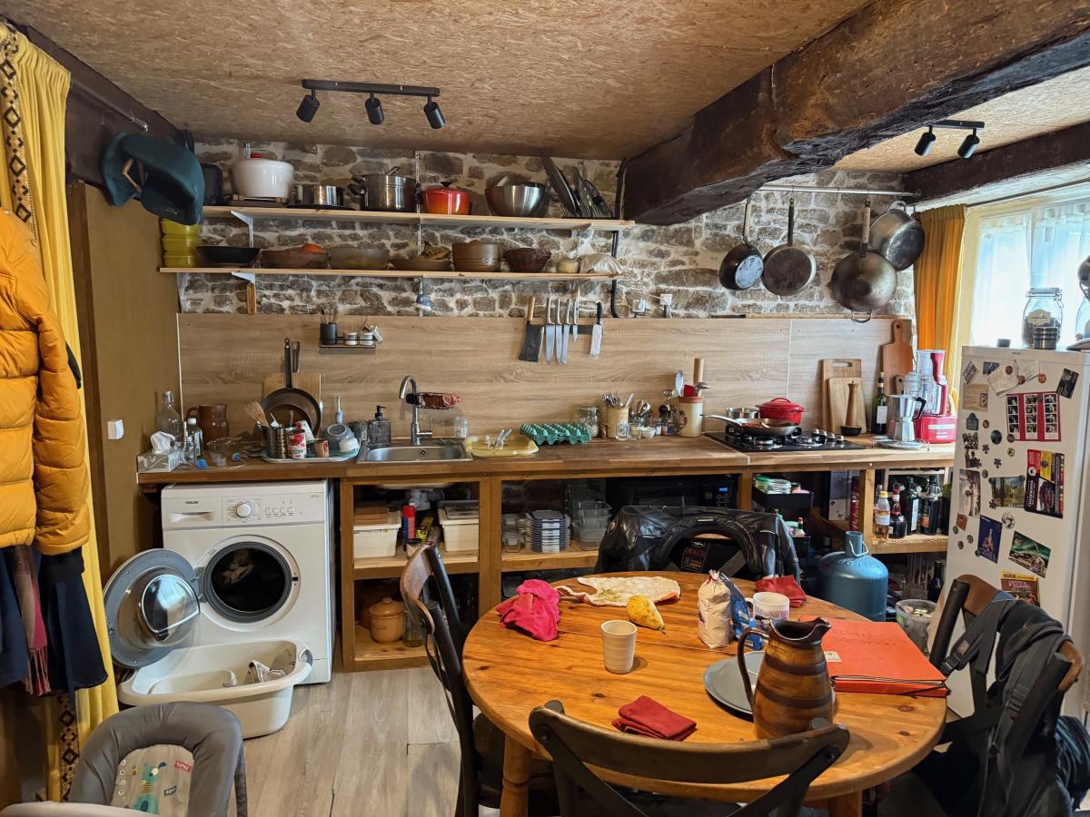 Rez-de-chaussée : pièce de vie avec cheminée et coin cuisine, salle d'eau / WC (toilette sèche) ;