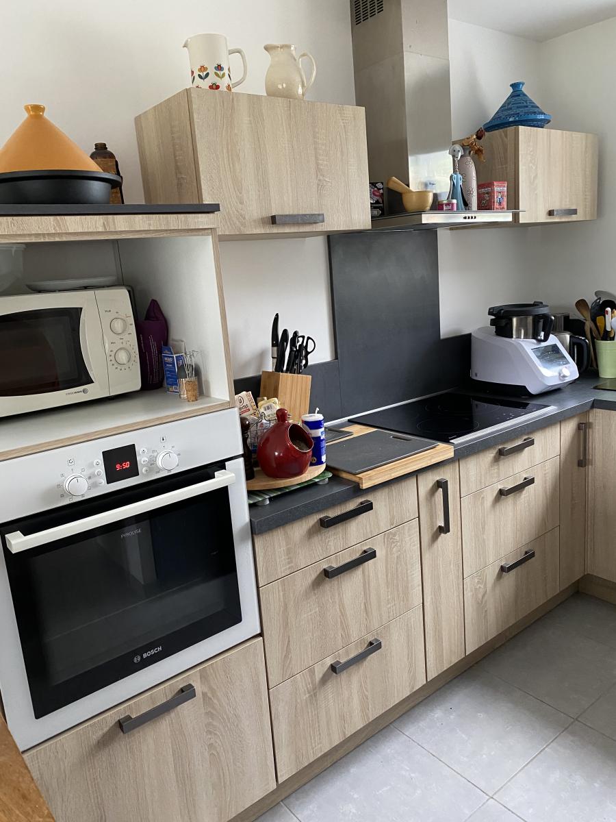 Au rez-de-chaussée : entrée avec dressing et placards, wc, cuisine aménagée et équipée ouverte sur le séjour/salon avec poêle à granulés programmable.