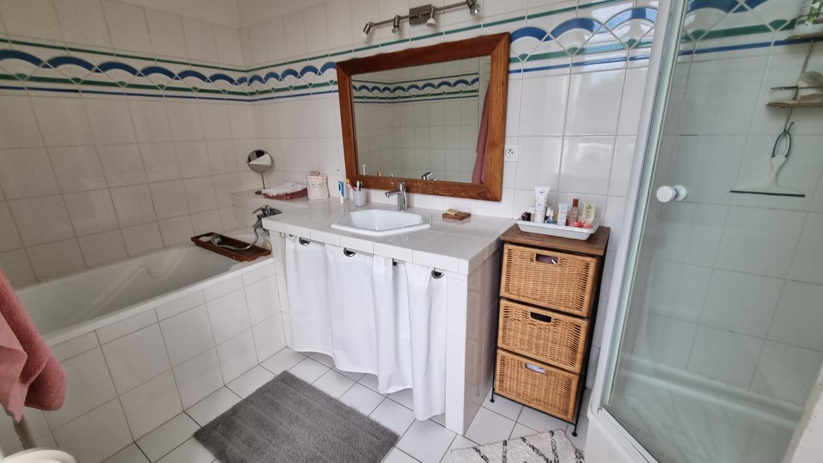 Au rez-de-chaussée : hall d'entrée, une cuisine aménagée et équipée, une grande salle à manger, un grand salon donnant sur le parc et la terrasse, wc avec lave-mains.