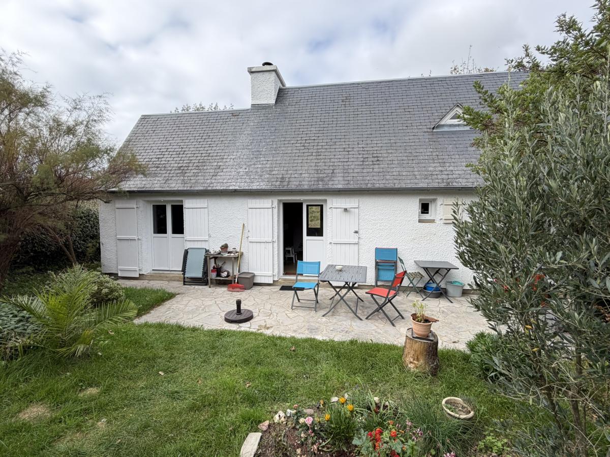 Jardin avec terrasse derrière, cabanon devant.