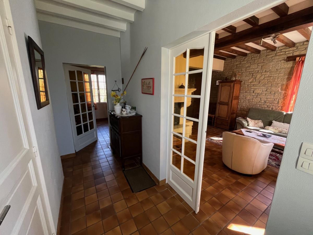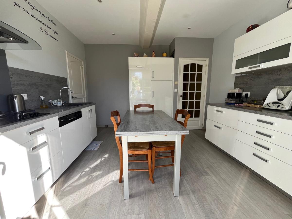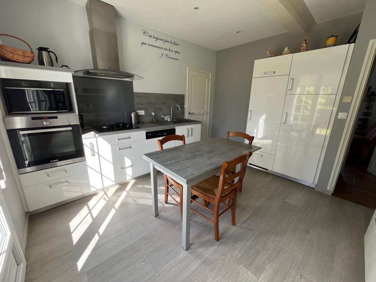 Entrée, séjour / salon avec cheminée insert 30 m², cuisine équipée (éléments hauts et bas, plaque de cuisson, hotte, four, lave-vaisselle, réfrigérateur, table à manger) 15 m², une chambre avec placard 12 m², petite salle de douches avec wc,