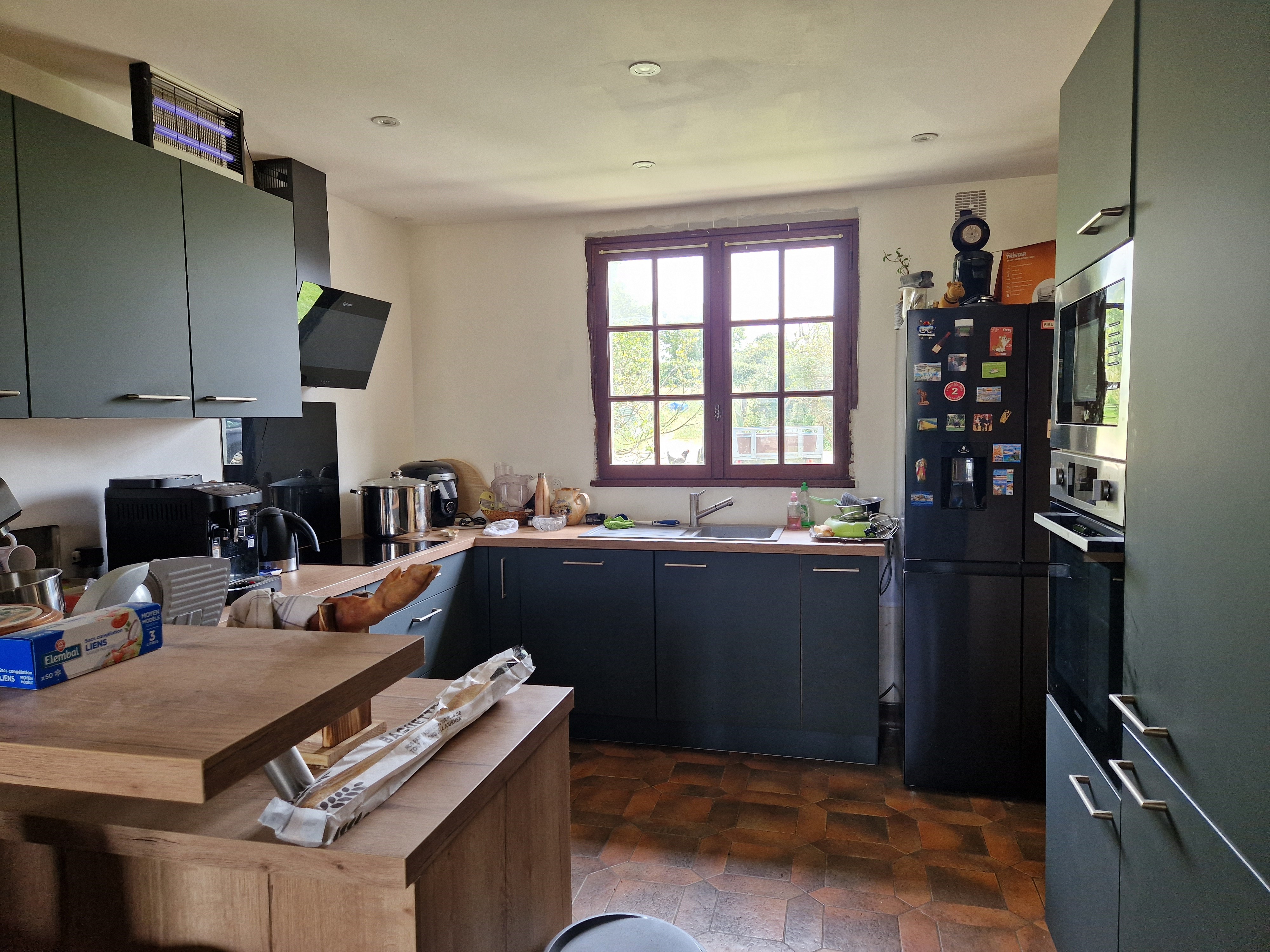 - rez-de-chaussée : une véranda, entrée avec placards, une grande pièce de vie : coin bureau avec poêle à granulés - salon - salle à manger avec poêle à bois - cuisine aménagée et équipée ouverte, couloir, une chambre, une salle d'eau, WC, un garage - chaufferie,