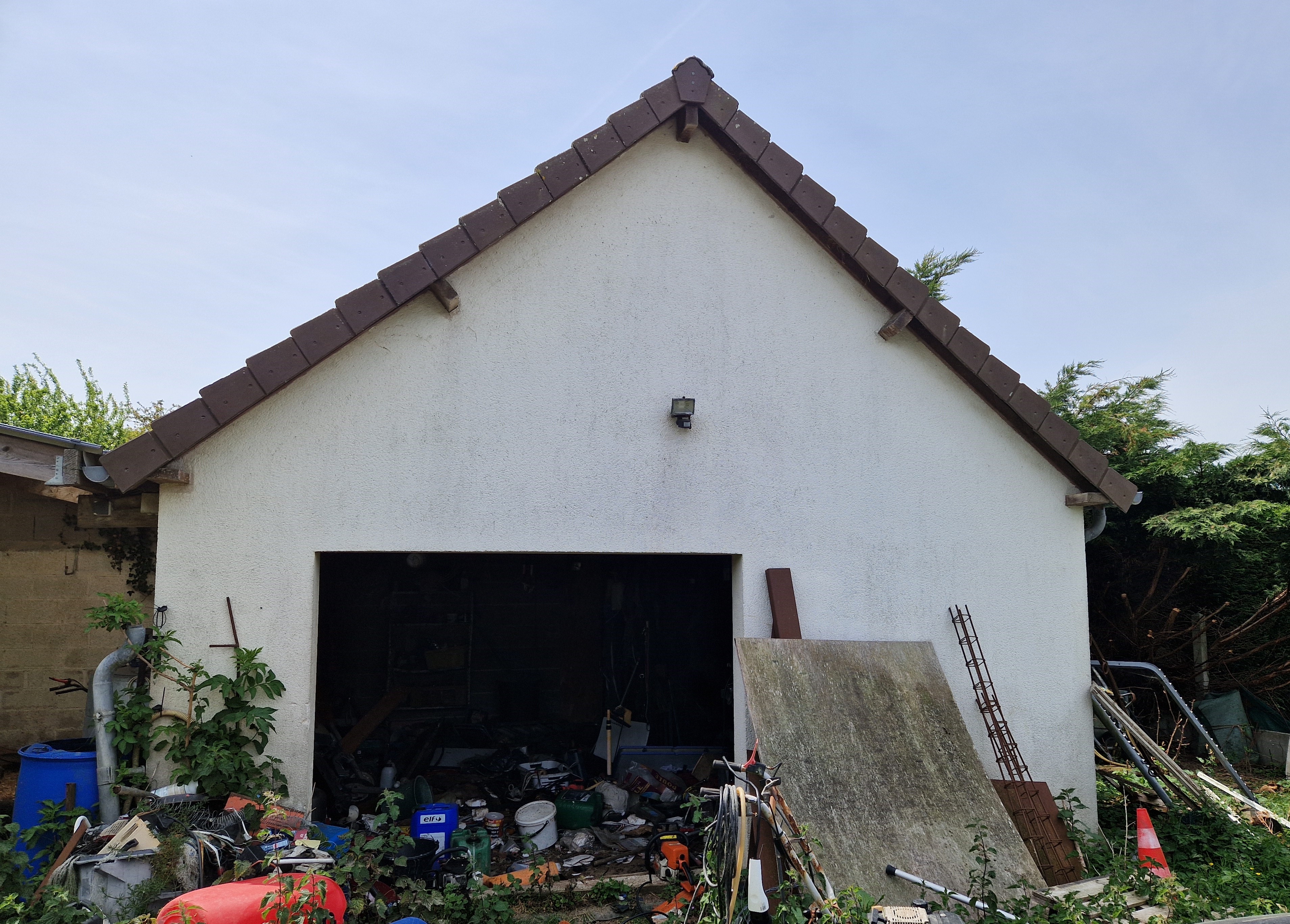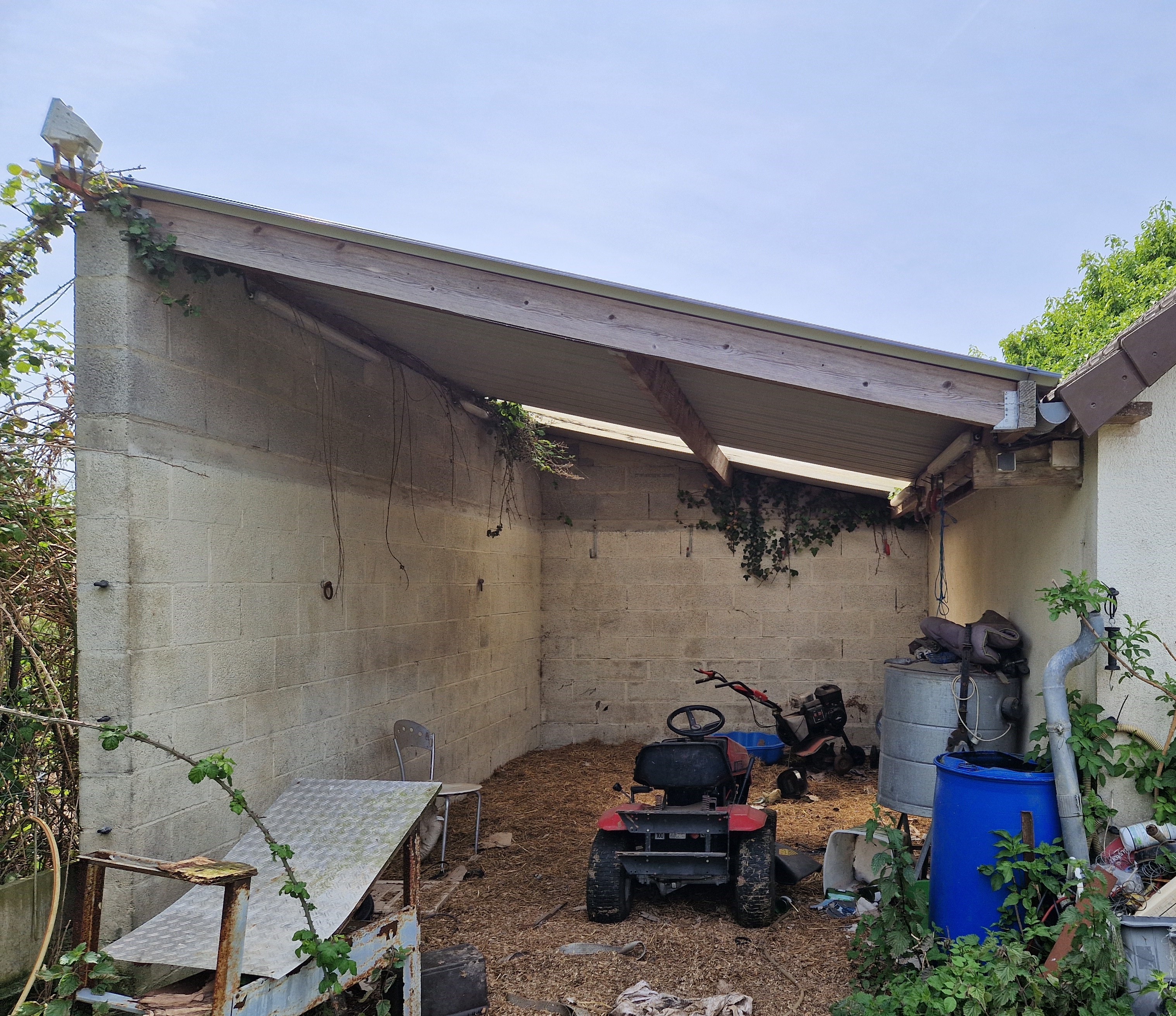 Un grand garage sous tuiles avec un autre garage ouvert accolé.