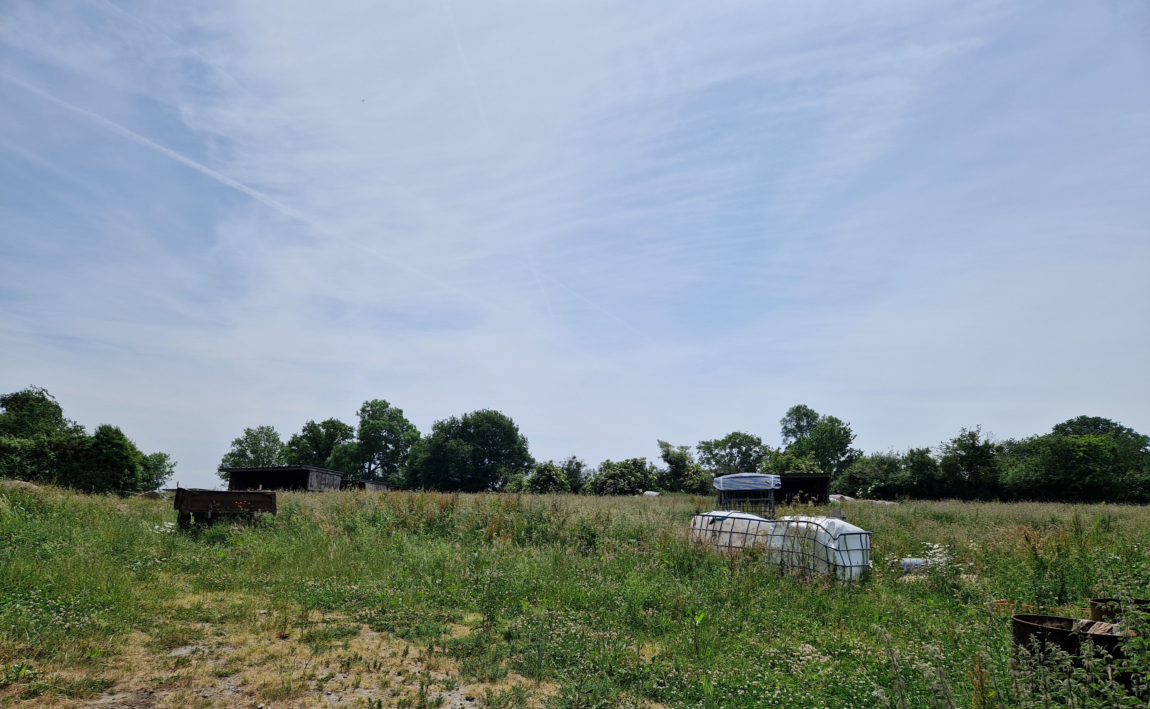 Une cabane de jardin . Poulailler. Jardin clos. Pré derrière la maison .