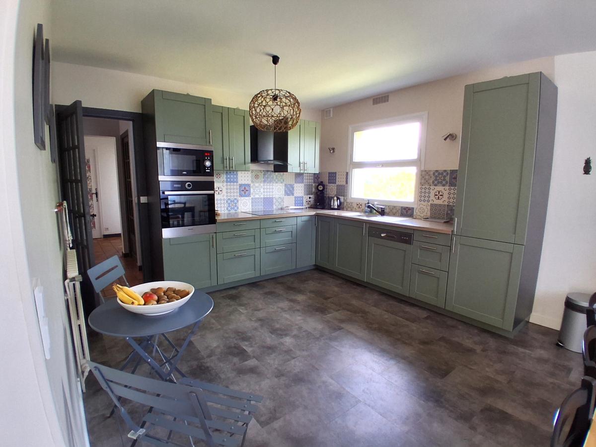 Maison confortable, jolie vue, comprenant, RDC : entrée - véranda chauffée -Pièce de vie : cuisine aménagée-salle à manger-séjour (poële à bois), chambre avec placard - salle d'eau - WC - débarras - Etage : palier - pièce de rangement - trois chambres chacune avec placard pouvant être aménagé en dressing - salle d'eau avec WC. Sous-Sol divisé en garage, chaufferie, atelier. Parc arboré. L'ensemble pour 1670 m².