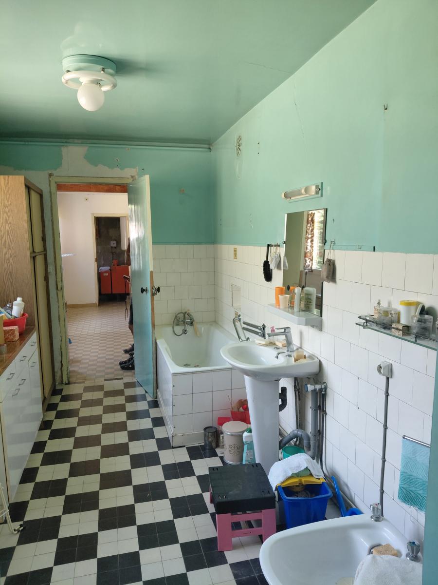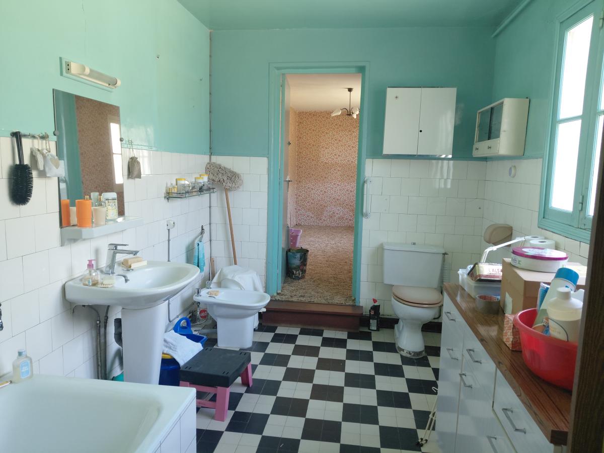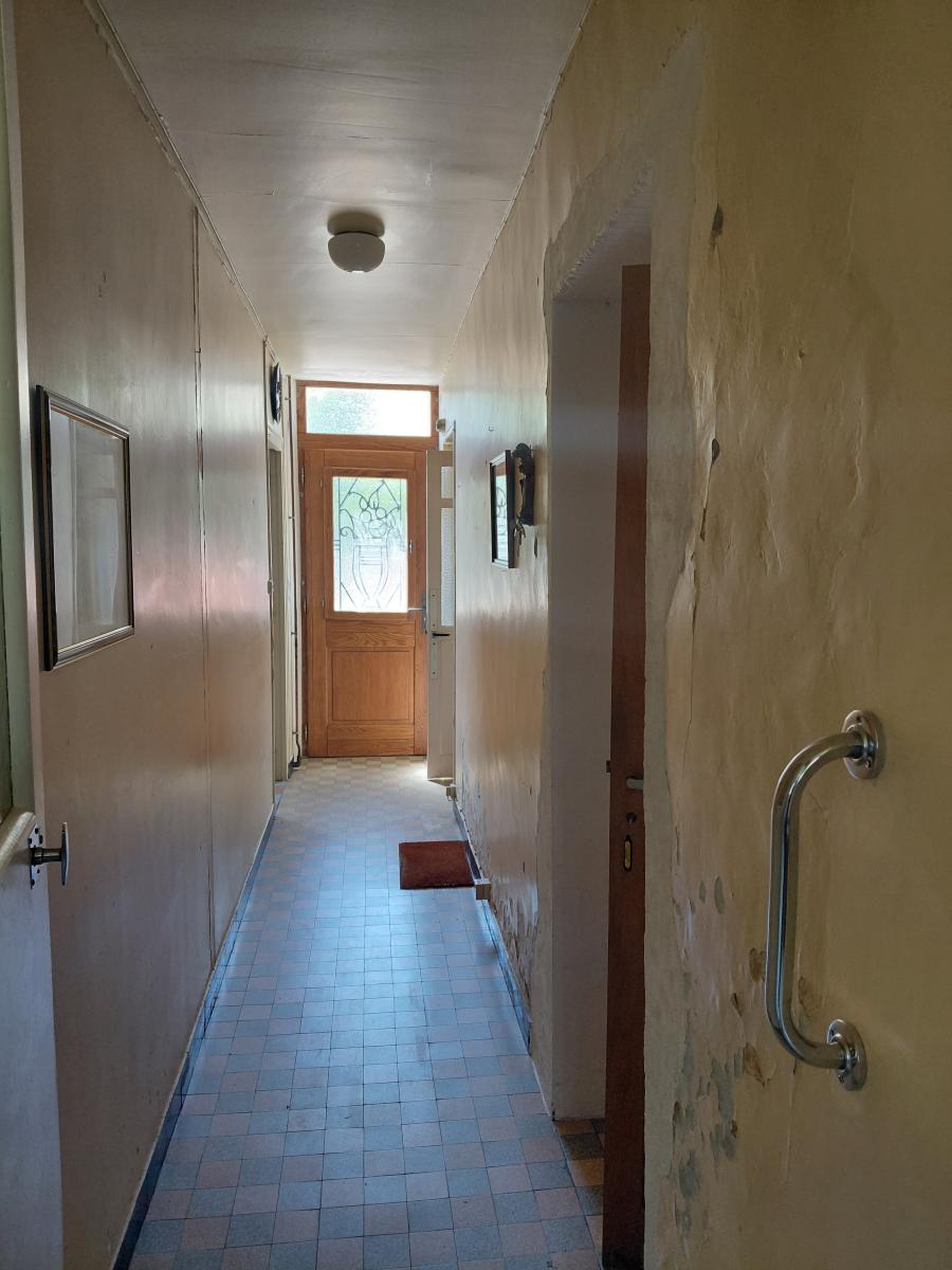 - en rdc : entrée/couloir - une salle à manger avec cheminée - un salon - une cave - deux chambres - une salle de bains avec wc - une cuisine - chaufferie.