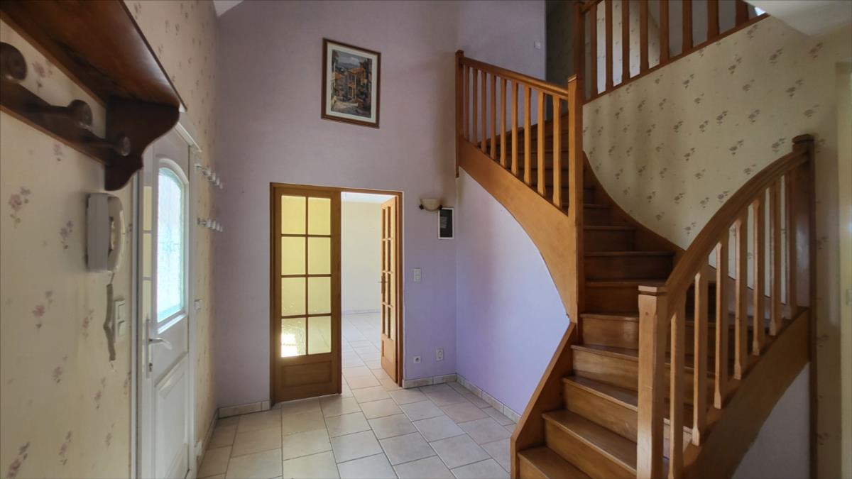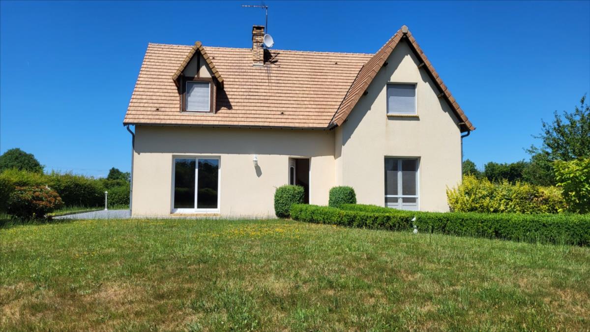 Dans un quartier au calme, et proche de quelques commerces, belle maison d'environ 135 m² bien entretenue comprenant : belle entrée avec escalier, séjour avec cheminée équipée d'un insert ouvert sur cuisine aménagée et équipée (réfrigérateur, hotte aspirante, plaque de cuisson), une chambre avec salle de douche à l'italienne, wc séparés, bureau ou chambre avec placards ; à l'étage : pièce-mezzanine surplombant l'entrée, trois chambres, wc séparés, grande salle de bains avec baignoire et douche), placards et radiateurs sèche serviettes ; chauffage au fioul + cheminée ; Volets roulants; sous-sol complet avec adoucisseur d'eau comprenant buanderie avec point d'eau, garage, cave à vin l'ensemble sur 1030 m² de jardin avec terrasse.
