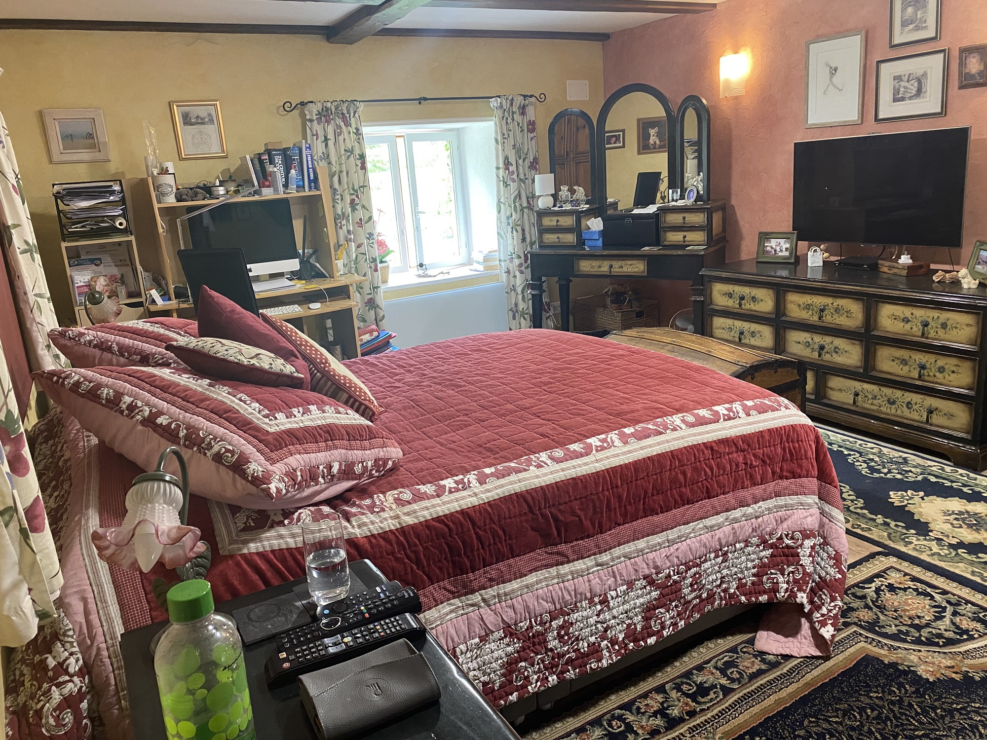 o Chambre 4 (5.63 x 4,45 m) avec une fenêtre donnant sur le jardin et une porte donnant vers l’extérieur permettant aux visiteurs d’accéder directement au gîte, radiateur,