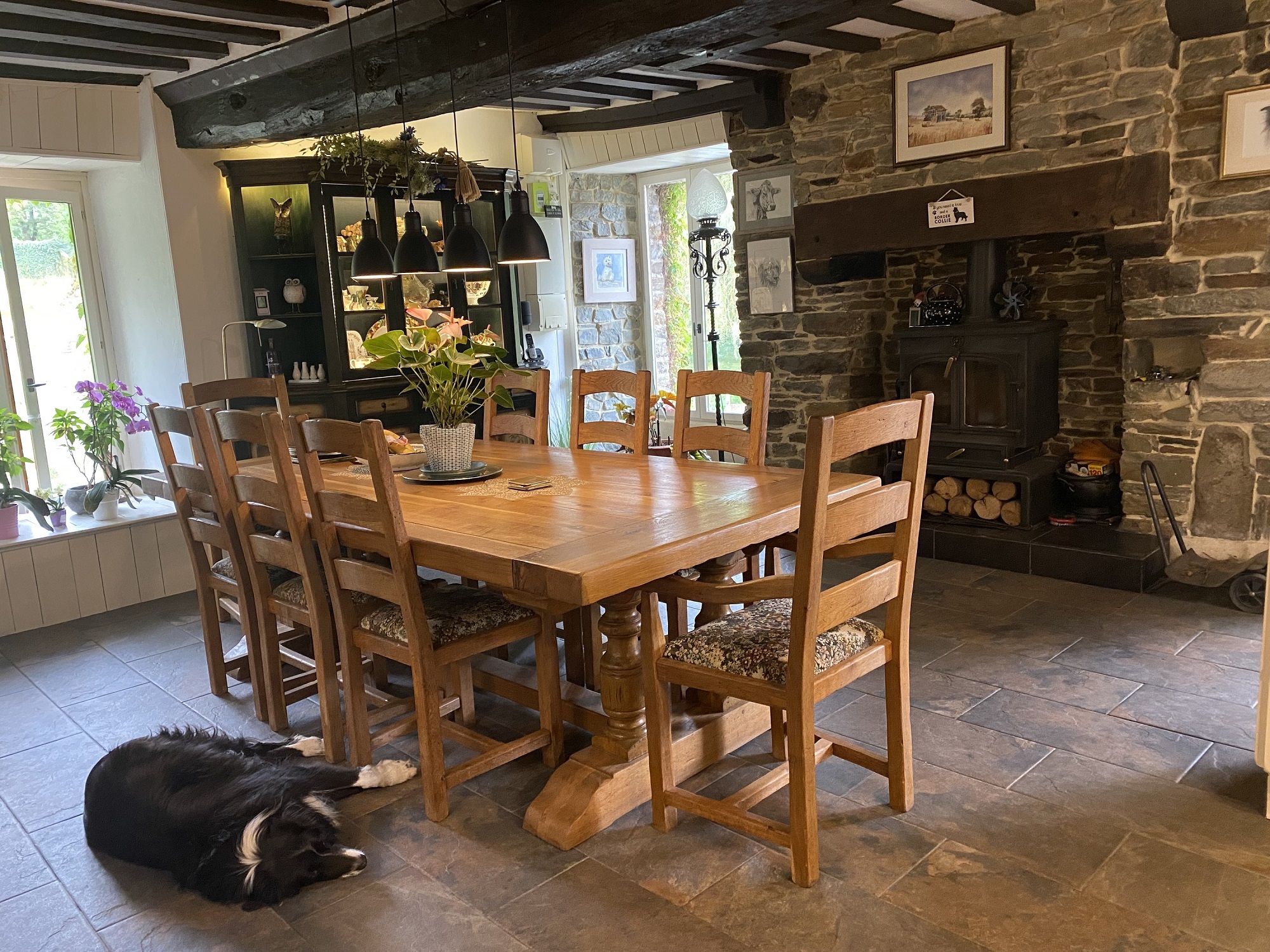 - Cuisine (5.11 m x 5,55 m) – avec une porte d’entrée et une fenêtre sur la même façade et une fenêtre donnant sur le jardin. Cette pièce comporte une cheminée avec insert, des poutres et des pierres apparentes, des dalles au sol et de multiples espaces de rangement avec des meubles hauts et bas.
