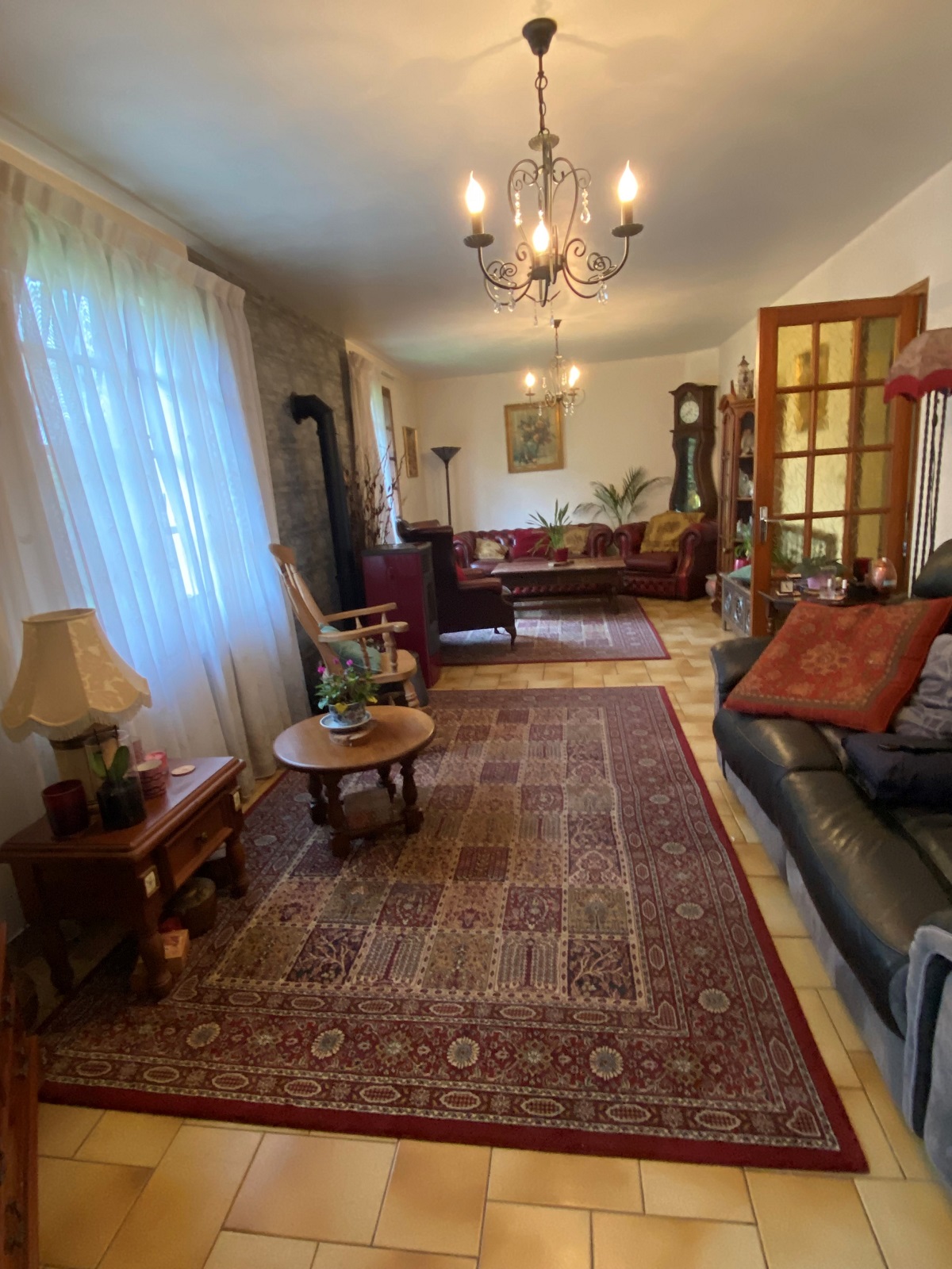 - Salon (8 m x 3,4 m) avec une fenêtre et une porte fenêtre en bois donnant sur le jardin à l’arrière de la maison. Le salon comporte un poêle à granulés installé il y a quatre ans environ. Carrelage au sol.