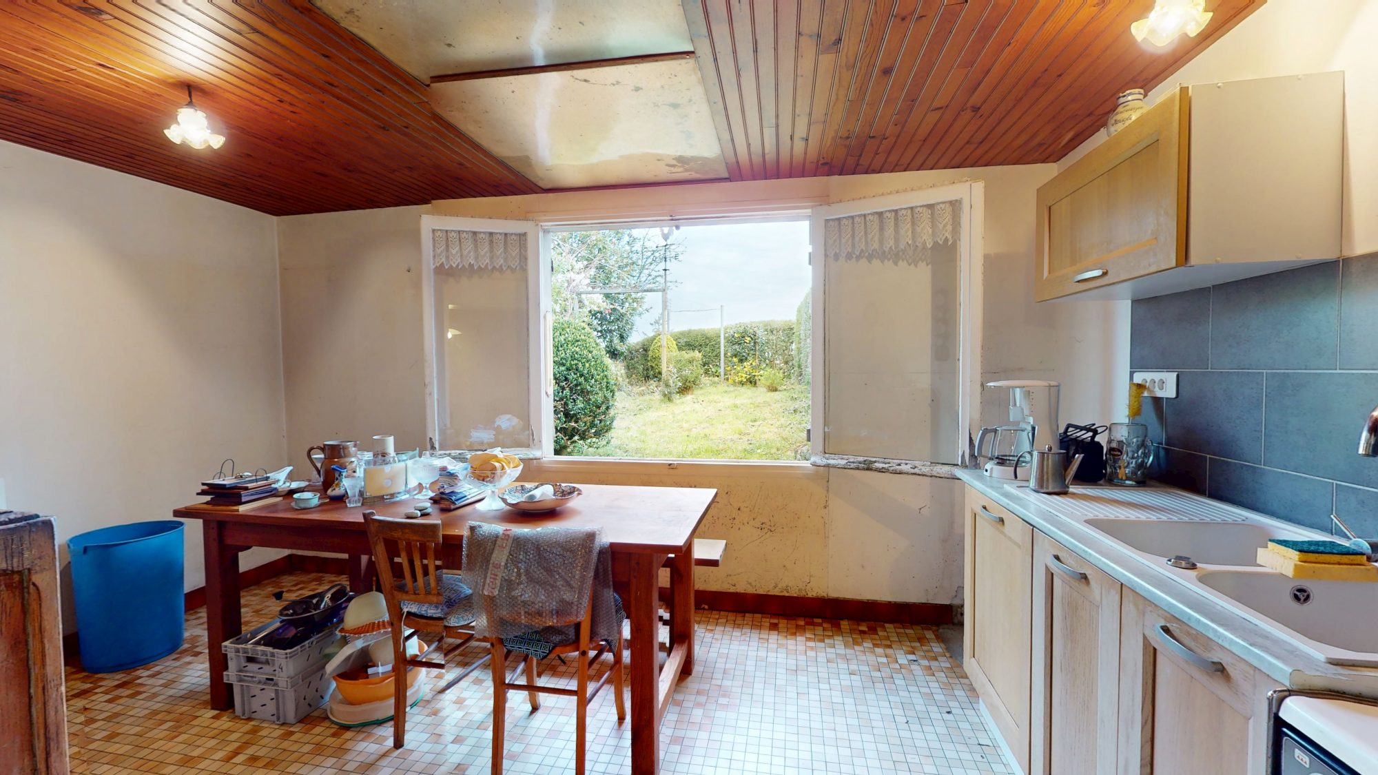 Sur un terrain de 182 m², maison de bourg comprenant : - Au rez-de-chaussée : dégagement avec poêle à granulés, cuisine, arrière cuisine / buanderie, séjour avec insert à bois et garage (dans lequel WC). - A l'étage : palier, trois chambres et salle d'eau. Jardin sur l'arrière et cellier en face de la maison. Chauffage électrique et huisseries bois simple vitrage. Assainissement à mettre aux normes.