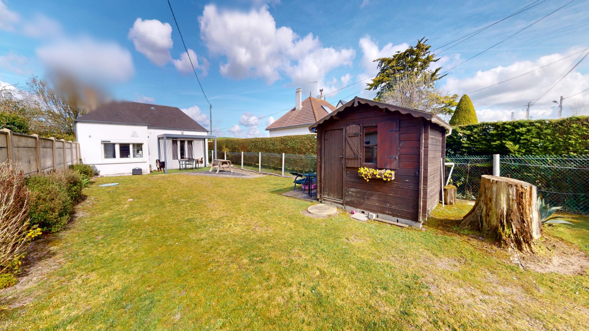 Terrasse avec pergola, cabanon de jardin et jardin autour.