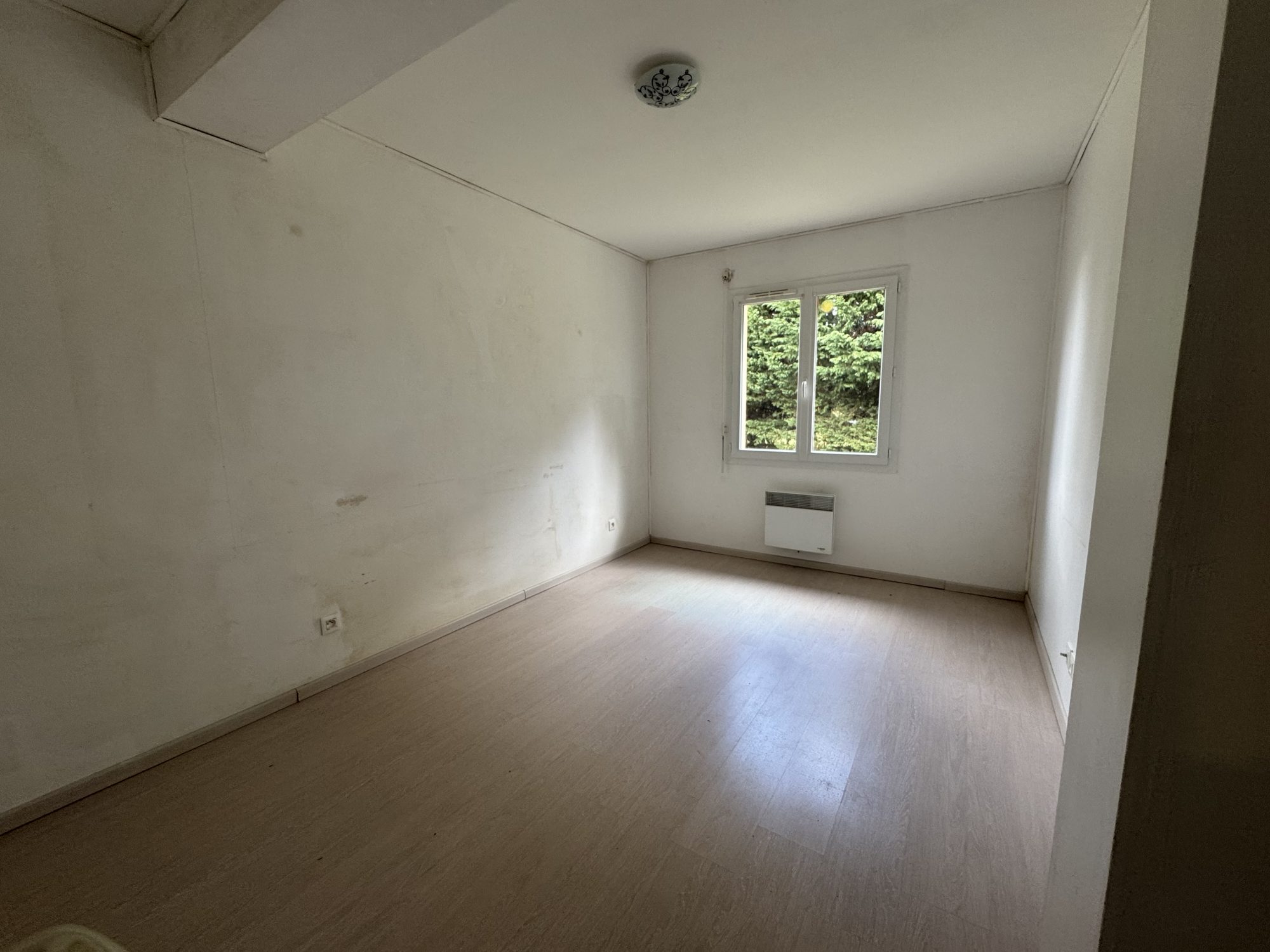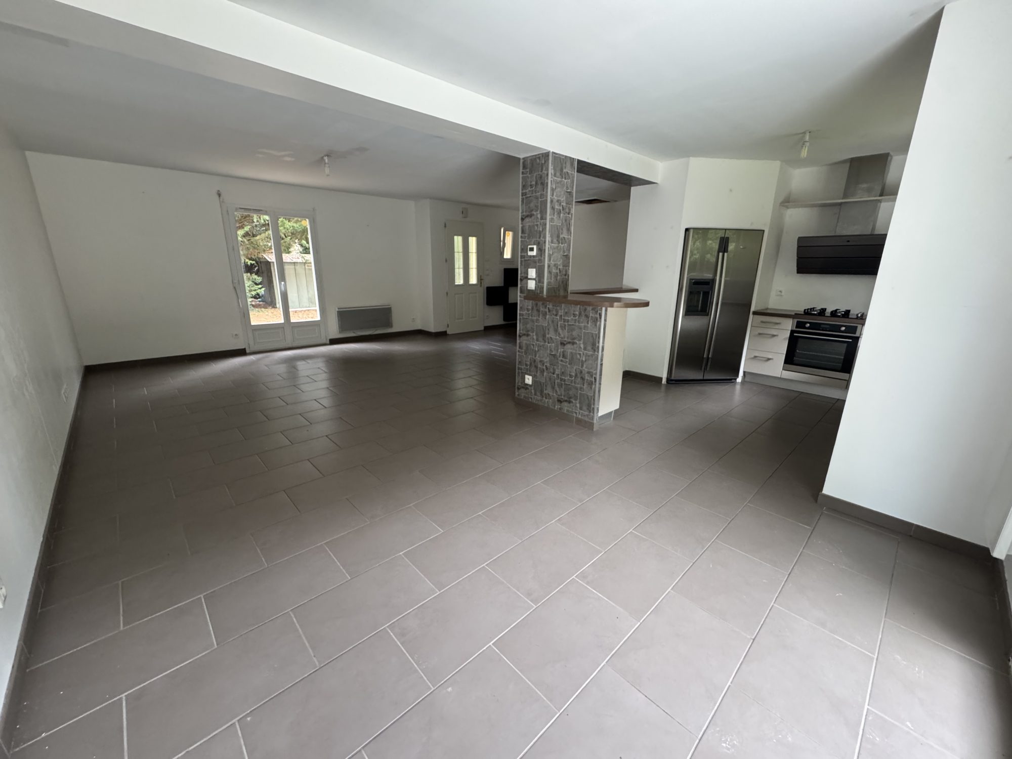 Pièce de vie avec cuisine aménagée ouverte (50m²), dégagement, 2 chambres, salle de bains, cellier et wc.