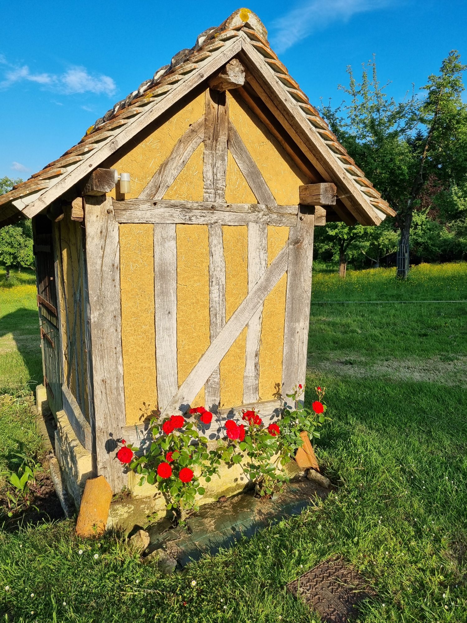 Ancien four à pain, garage et grange à colombage avec deux garages, pièce de 35m², wc et grenier.