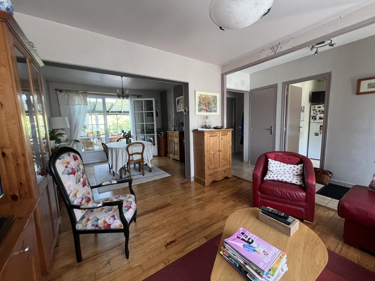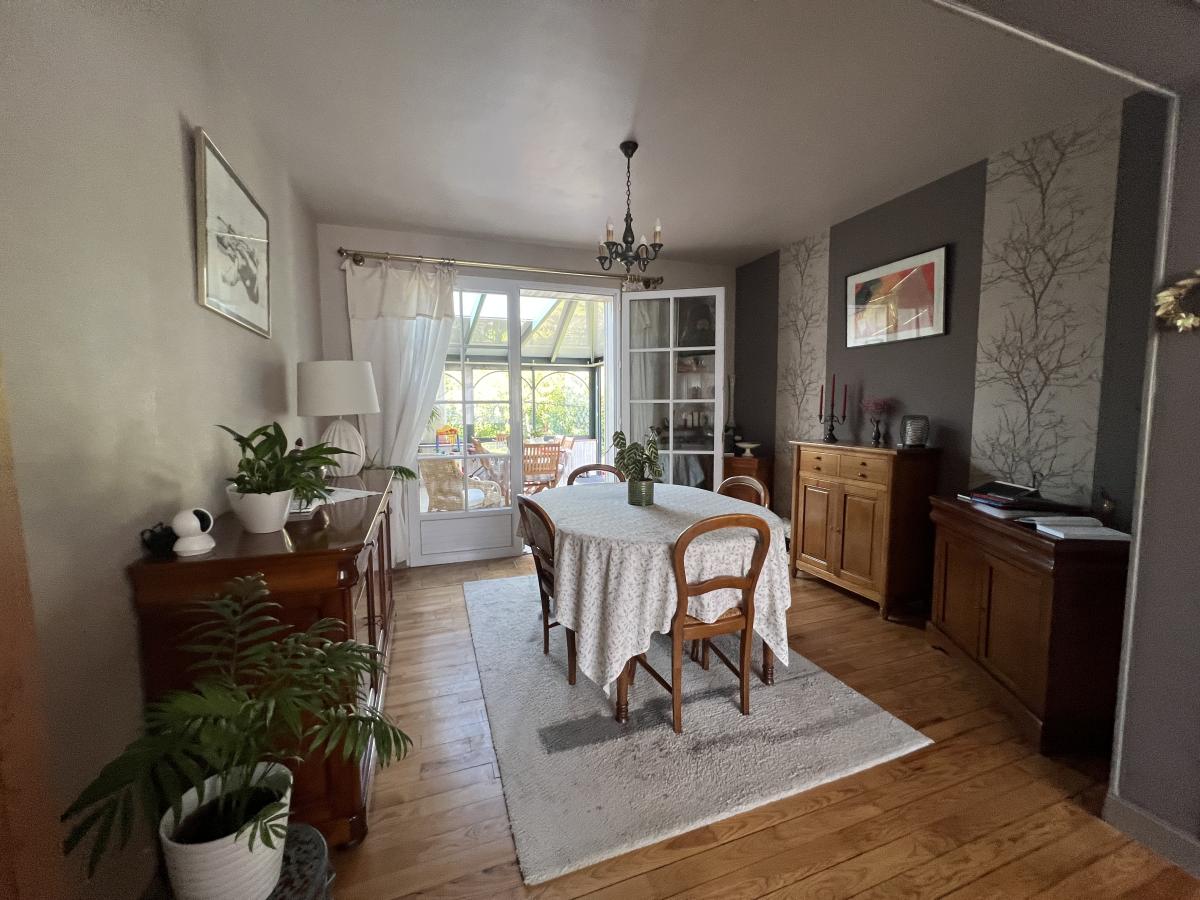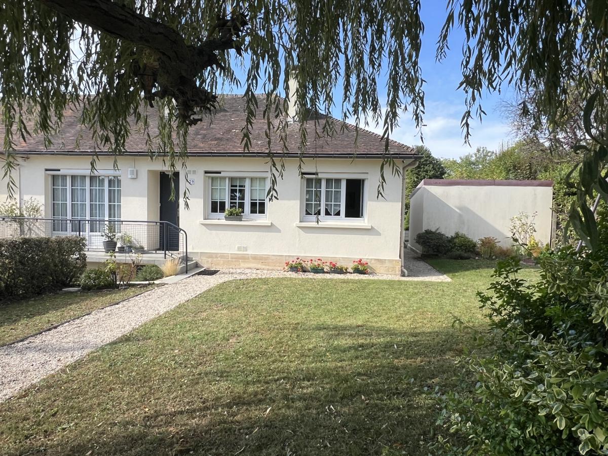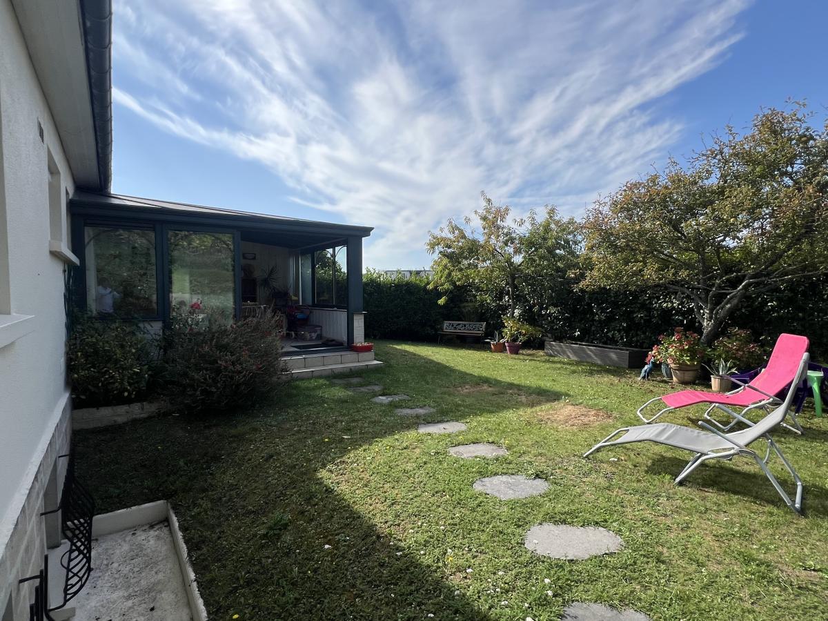 CAEN RIVE GAUCHE proche rue d’Authie, Quartier calme et recherché, charmante maison mitoyenne de plain pied surélevé comprenant entrée, séjour salon 26 m2, belle véranda de 14 m2, cuisine aménagée, 2 chambres, salle de bains, wc. Sous sol complet avec chambre et salle d'eau, bureau, buanderie, garage. Fenêtres PVC avec volets roulants solaire. Combles en partie aménageables. Terrain sans vis à vis de 580 m2 avec dépendance. Très bon état général. DPE : E