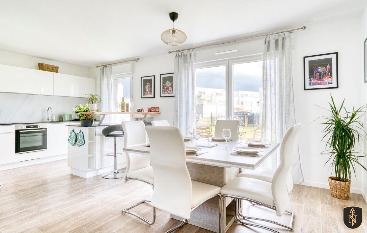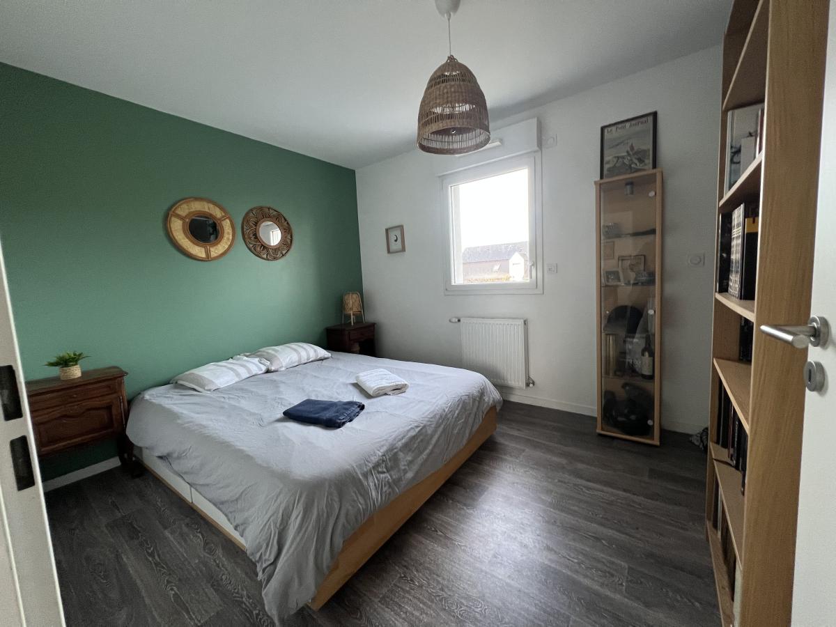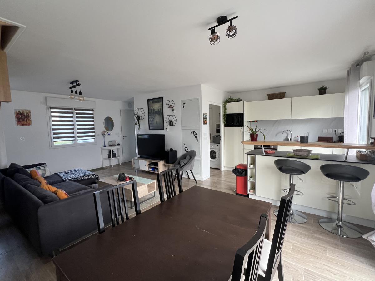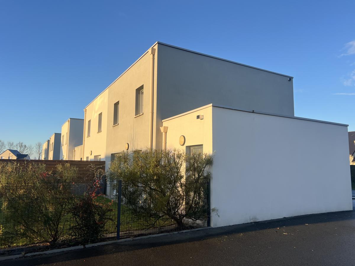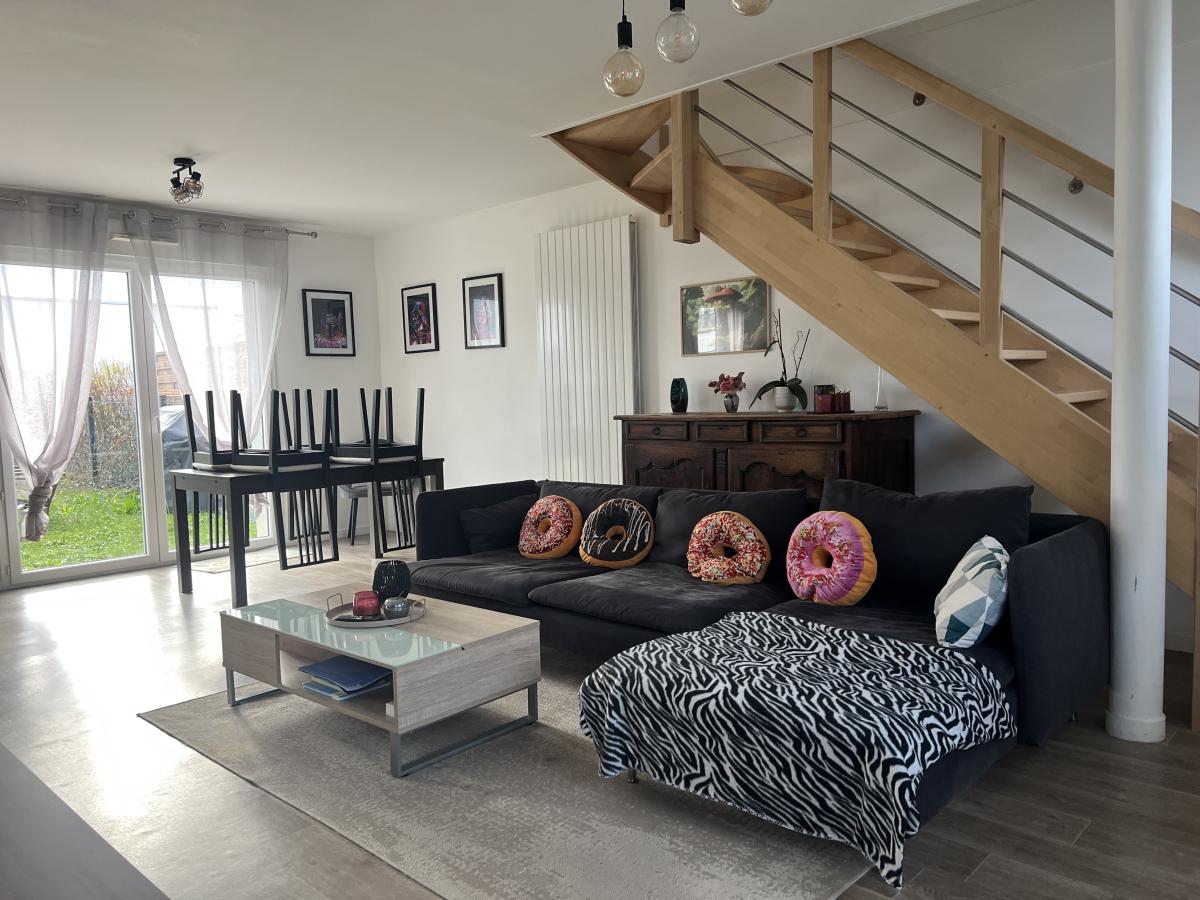 CAMBES EN PLAINE - CAEN NORD bus de ville, ravissante maison 2019 mitoyenne d'un côté, comprenant entrée avec placards, cuisine aménagée ouverte sur séjour salon 35 m2, 3 chambres, salle de bains avec wc, buanderie, wc avec lave mains. Garage attenant. Terrain clos de 240 m2. Chauffage gaz de ville. Parfait état général. DPE : C
