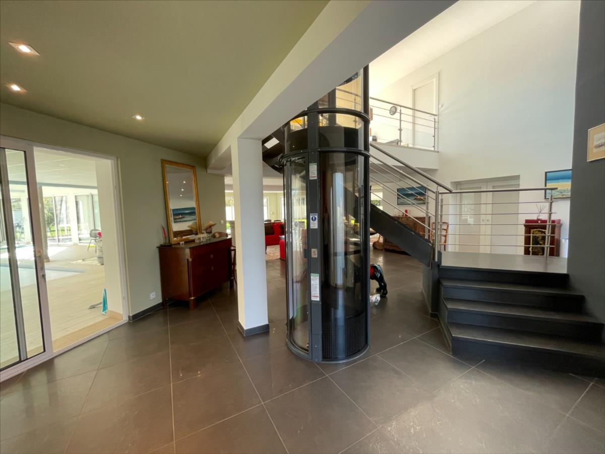 ascenseur, bureau 18m², 1 suite : chambre 20m²+ sdb (baignoire et douche) placard, piscine 40m² intérieure 120m² chauffée avec sde et WC,