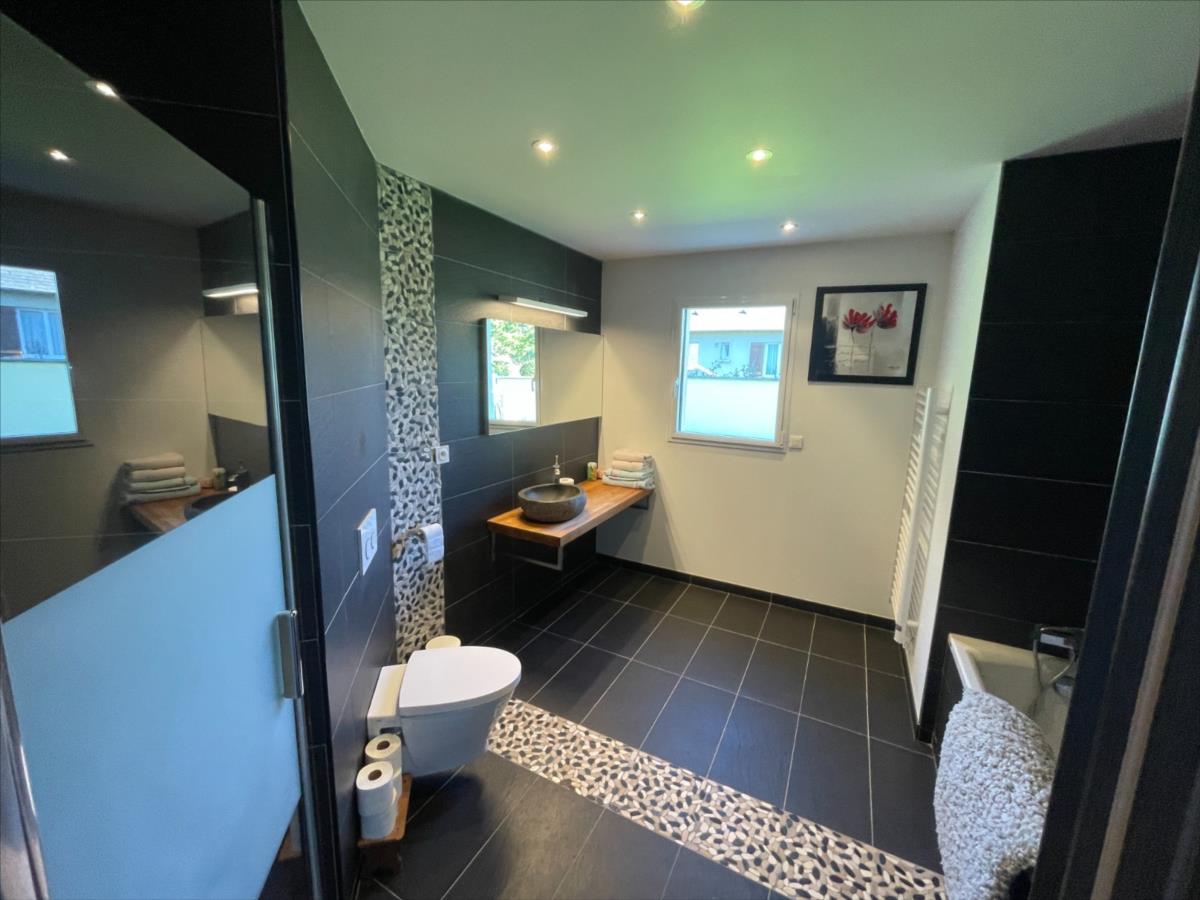 grande terrasse 65m², Double garage 85m² avec lavabo et en sous-sol 85m²accès par le garage