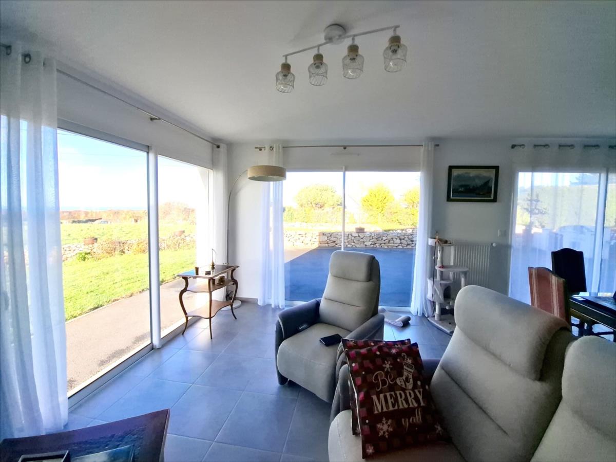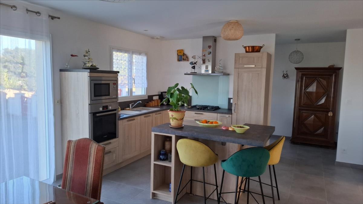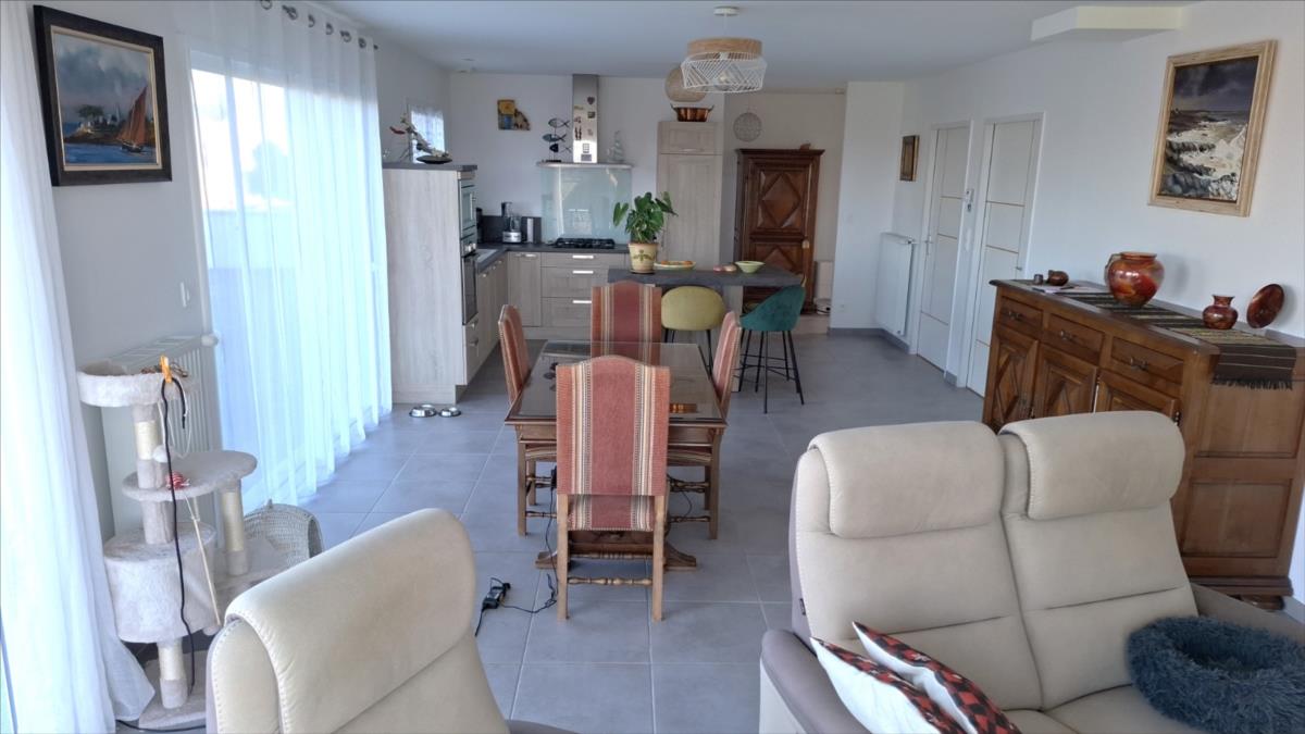 Avec une vue sur la mer, à 1.2 km de la plage et à moins de 5 kms des commercesPavillon de 2016, en parfait état, offrant une autonomie de plain-pied, composé de :. Au rez-de-chaussée : entrée desservant une belle pièce de vie (salle - salon) avec vue mer, cuisine ouverte aménagée et équipée, deux chambres, salle d'eau (douche à l'italienne), arrière-cuisine.. A l'étage : combles aménageables.Grand garage avec partie buanderie et grenier au dessus.Cour d'accès bitumée, jardin autour sur lequel cabanon de jardin.Pompe à chaleurCuve récupération eaux de pluie enterréeAspiration centraliséeAssainissement individuel conforme.