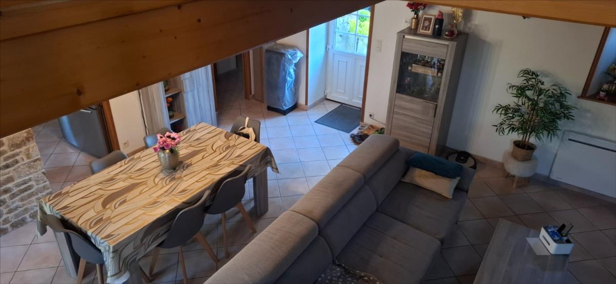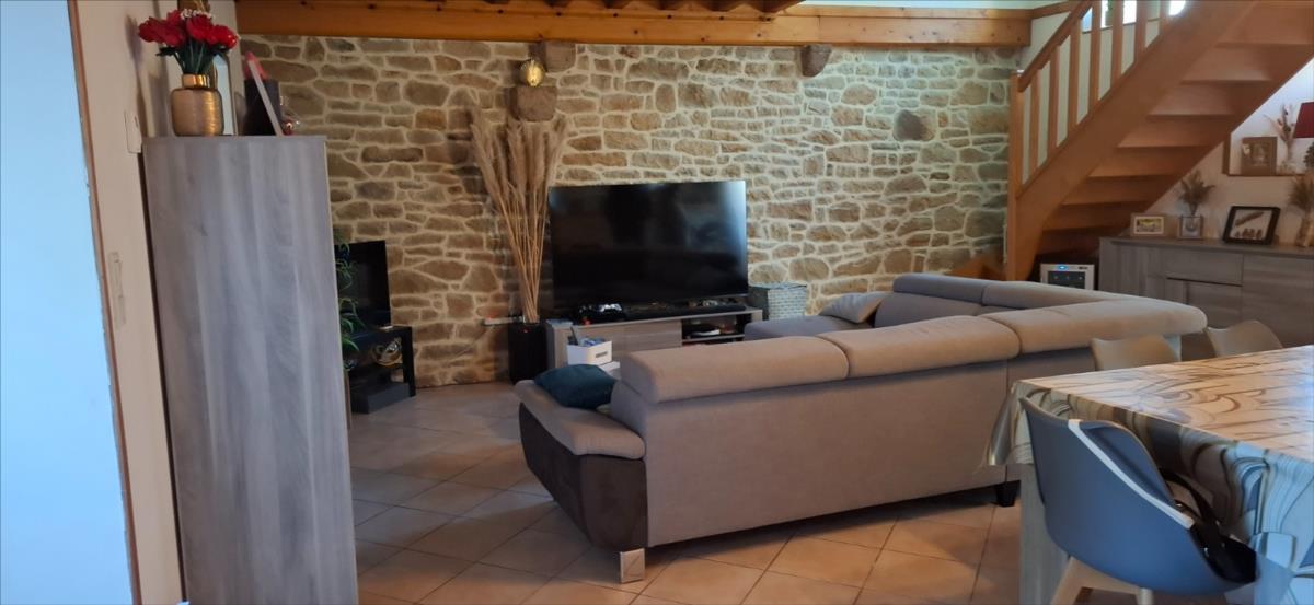 Maison en pierre, couverte en ardoise, restaurée il y a une vingtaine d'année, comprenant :. Au rez-de-chaussée : séjour - salon avec cuisine ouverte, arrière cuisine, dégagement avec petit dressing, WC.. A l'étage : palier desservant trois chambres, salle d'eau.Cour sur l'arrière avec dépendance en bois. Jardin.Le tout pour une surface cadastrale de 560m².
