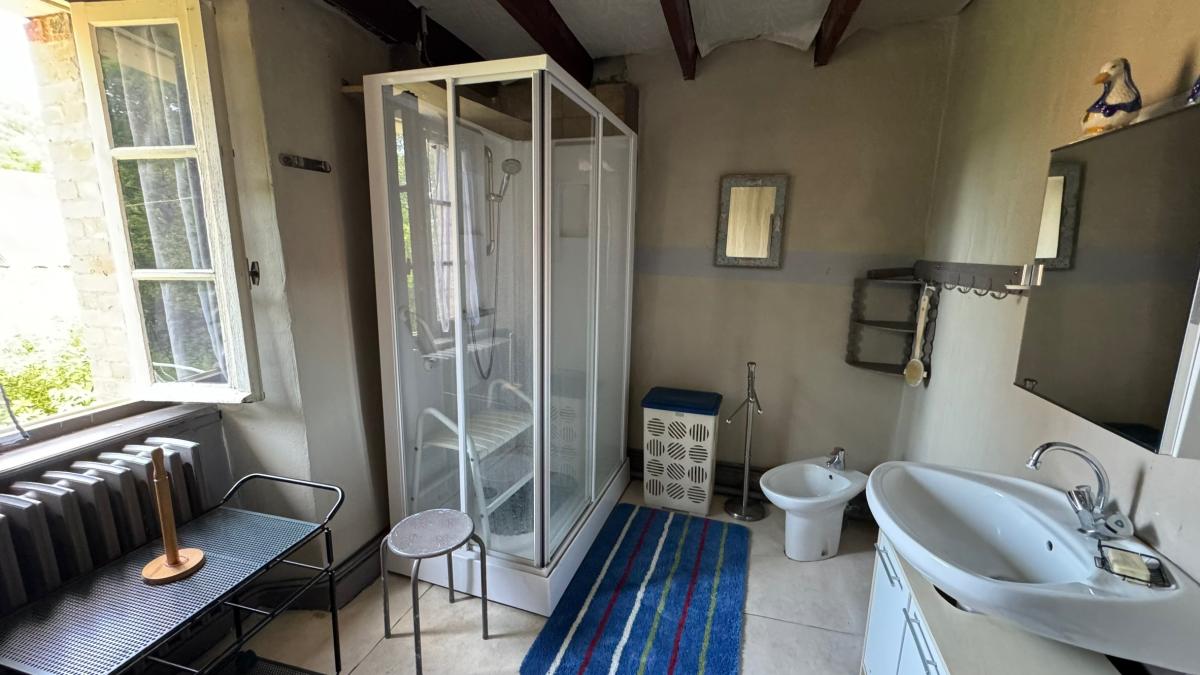 - A l'étage : trois chambres (23m², 15m² et 10.5m²), palier avec accès grenier, salle de douche de 7.5m² avec WC.