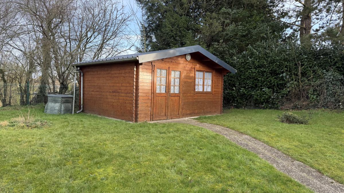 Extérieur : garage avec portes de chaque côté motorisées , chalet avec électricité, cour en enrobé.