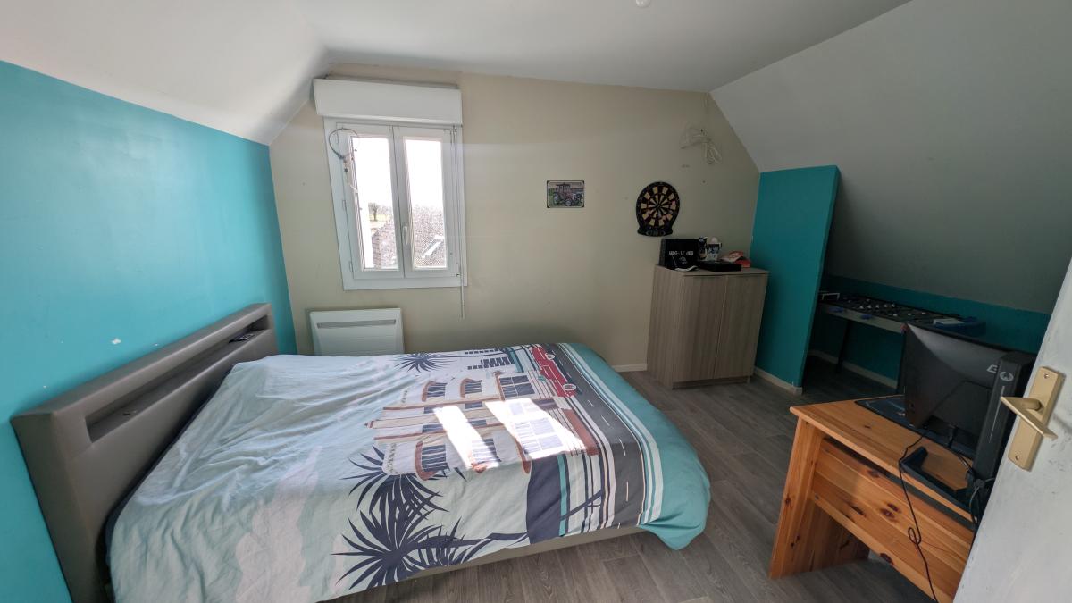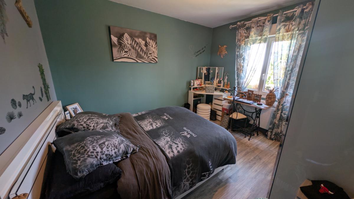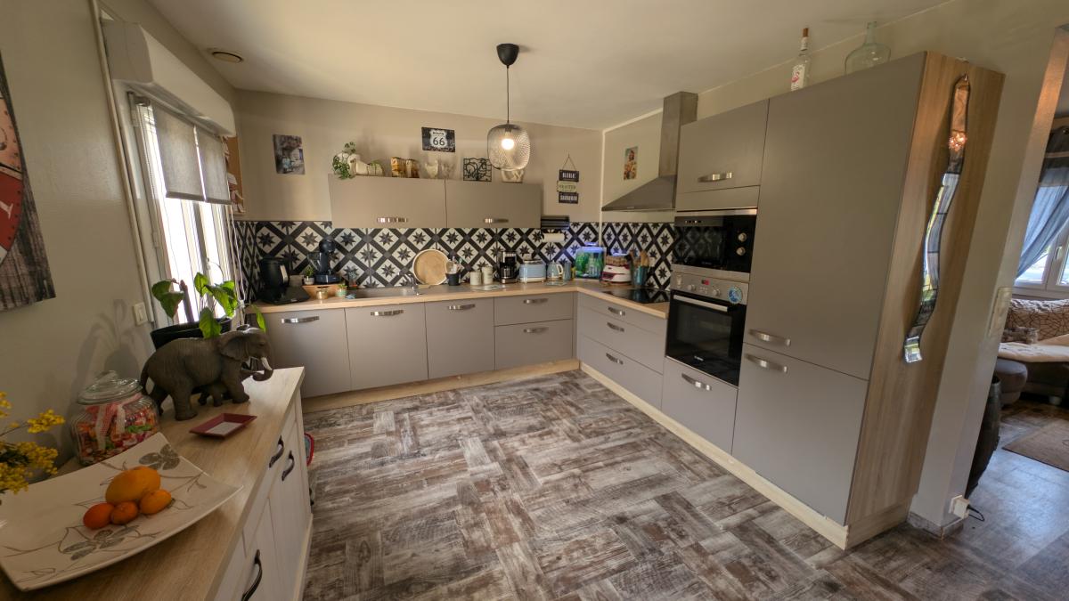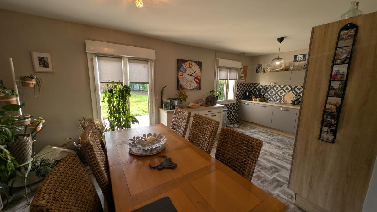 Au rez-de-chaussée : entrée ouverte, séjour avec cuisine ouverte et poêle à bois, dégagement desservant deux chambres, salle d'eau et wc,