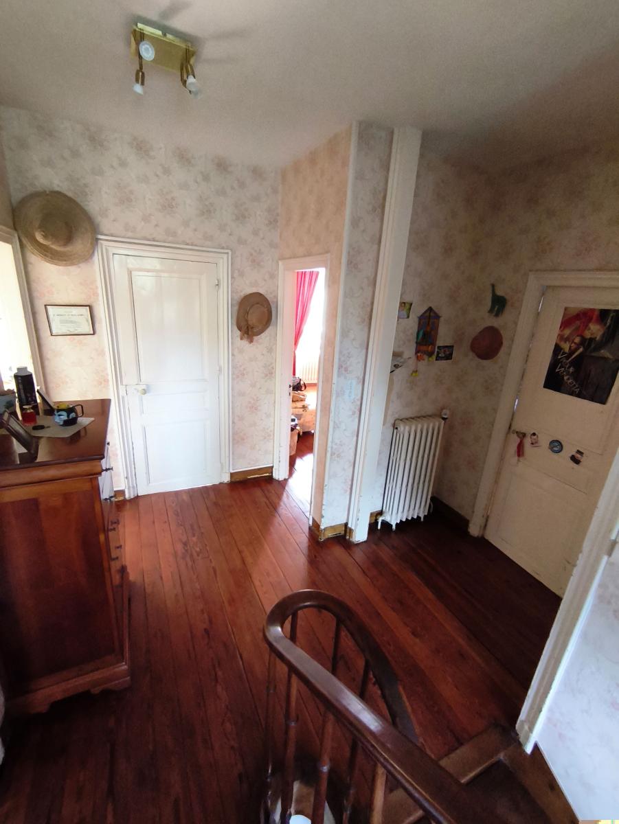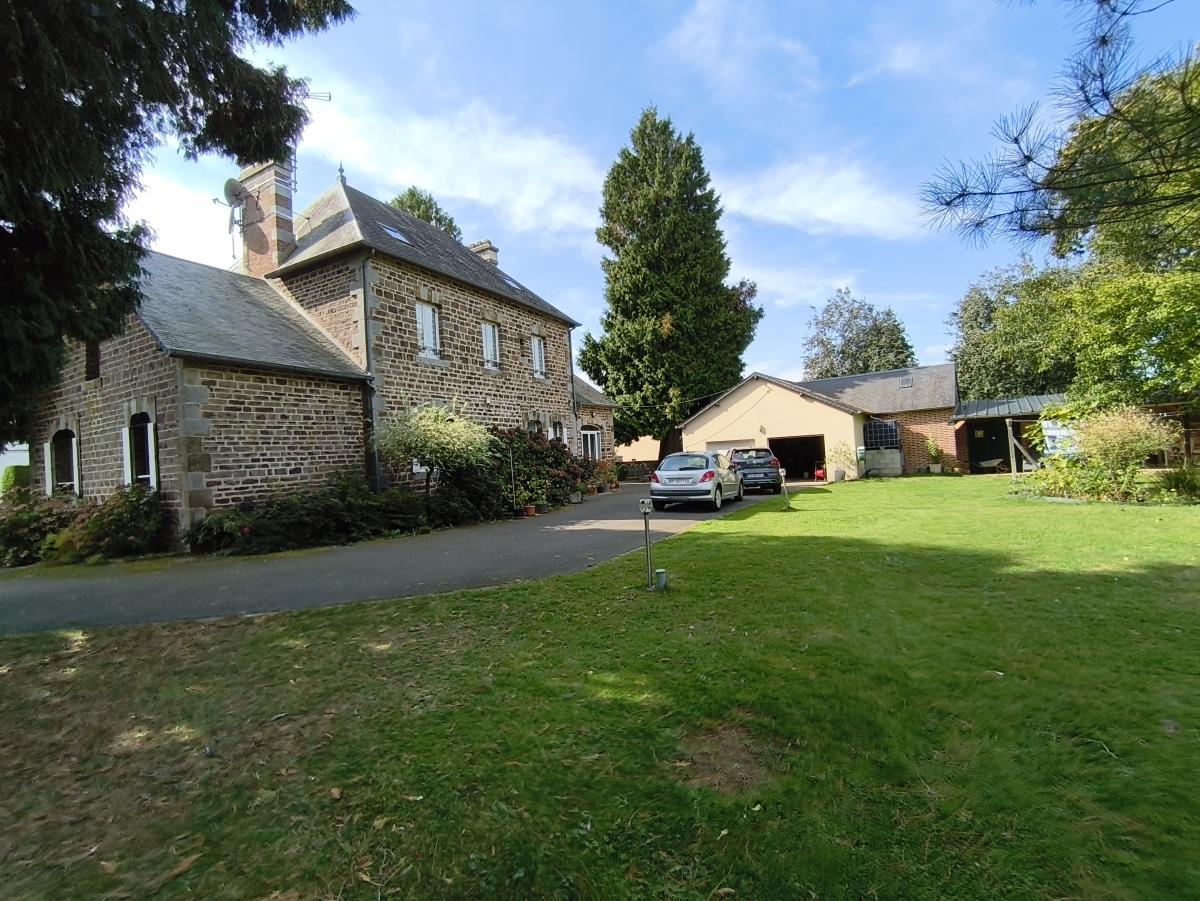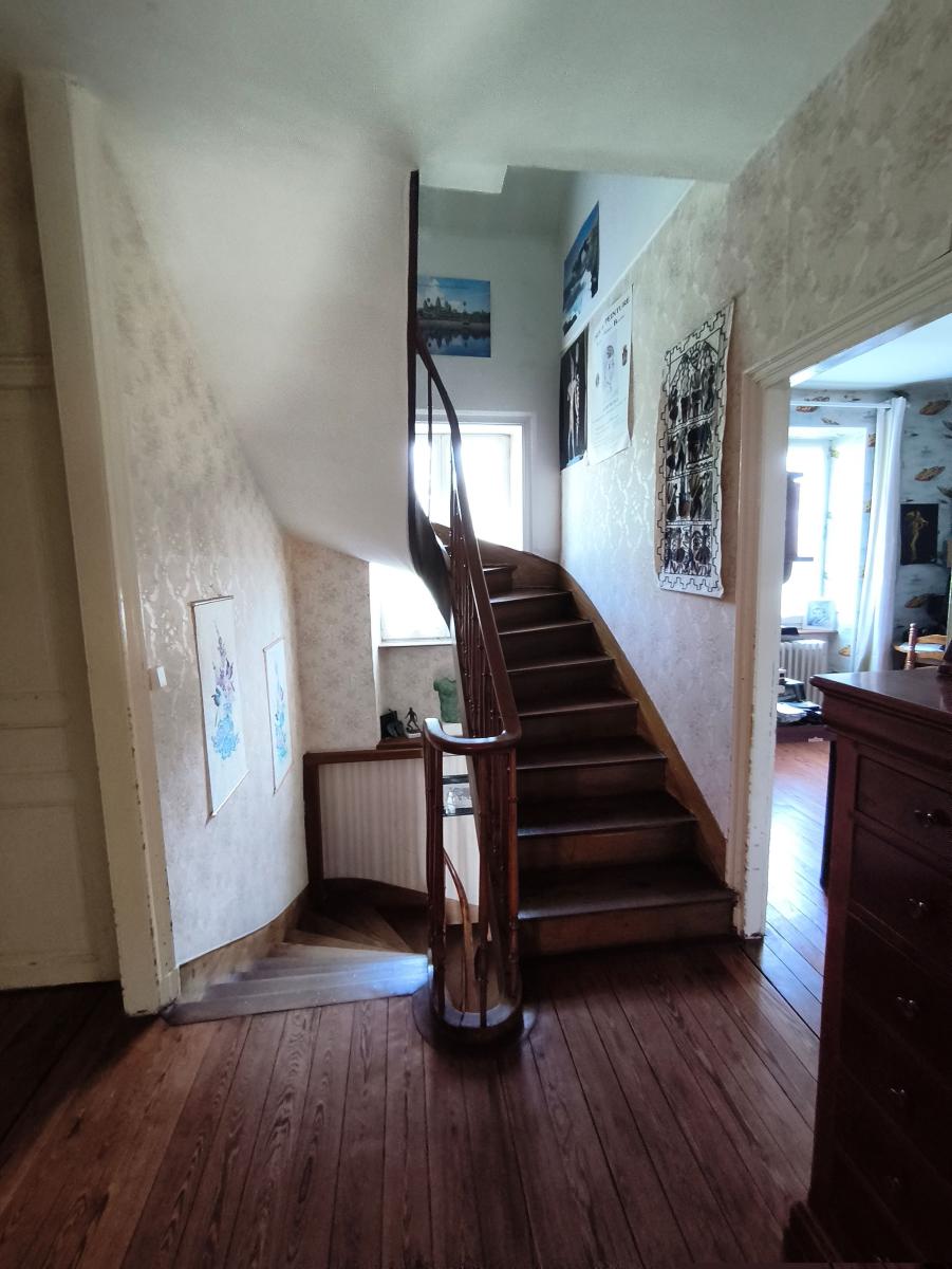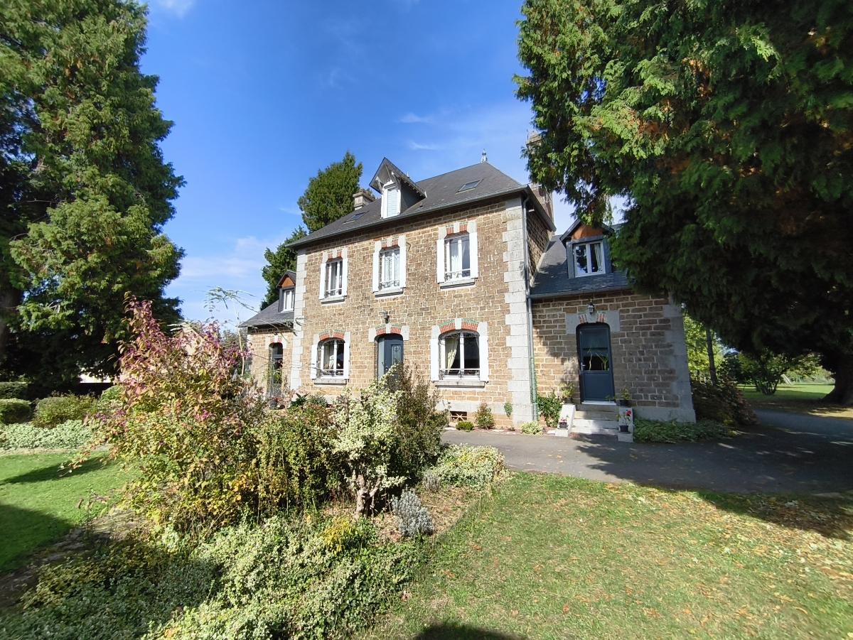 A proximité du bourg, maison de maître de 9 pièces principales, avec garage sur un terrain de 3.500 m². Le rez-de-chaussée est composée d'une entrée, un séjour-salon de 43 m², une cuisine aménagée, une arrière cuisine, une chambre et cabinet de toilette. Au 1er étage : palier desservant 5 chambres, un bureau, une salle de bains et un wc. Au 2ème étage : une pièce et une chambre. Cave en sous-sol. Garage 2 emplacements et appentis en dépendance. L'ensemble sur un terrain de 3.500 m² (cour, verger). Chauffage central fioul. DPE : D.
