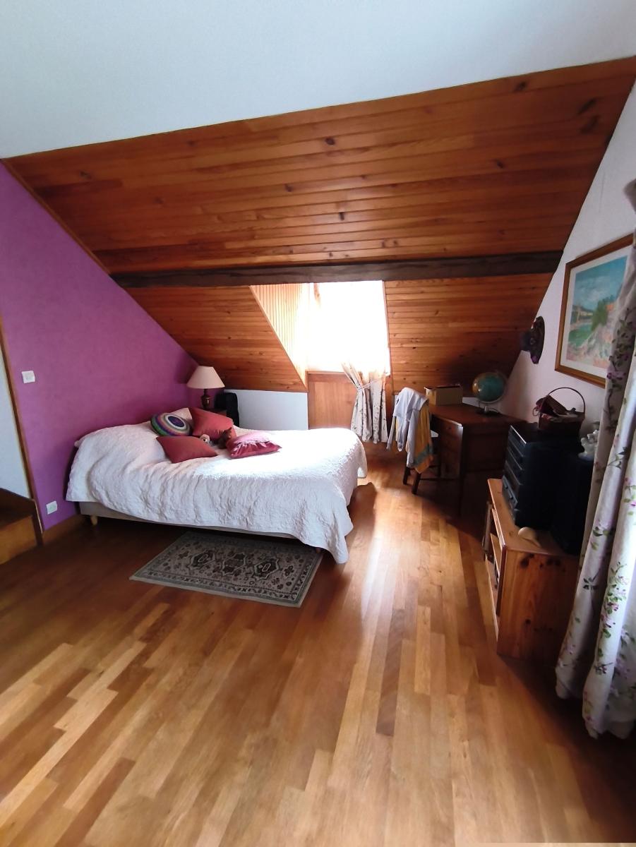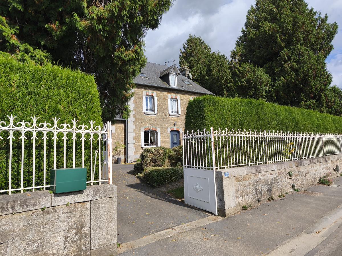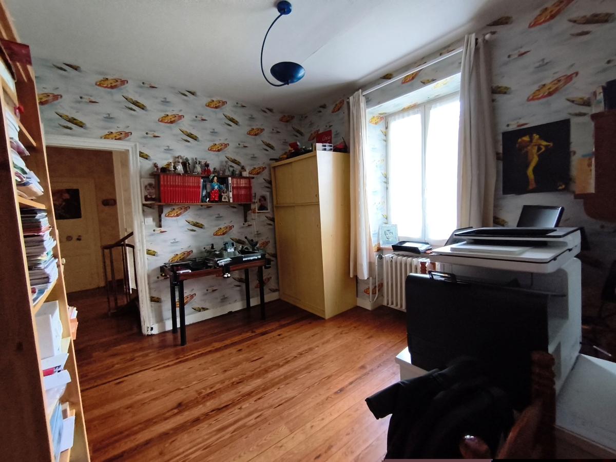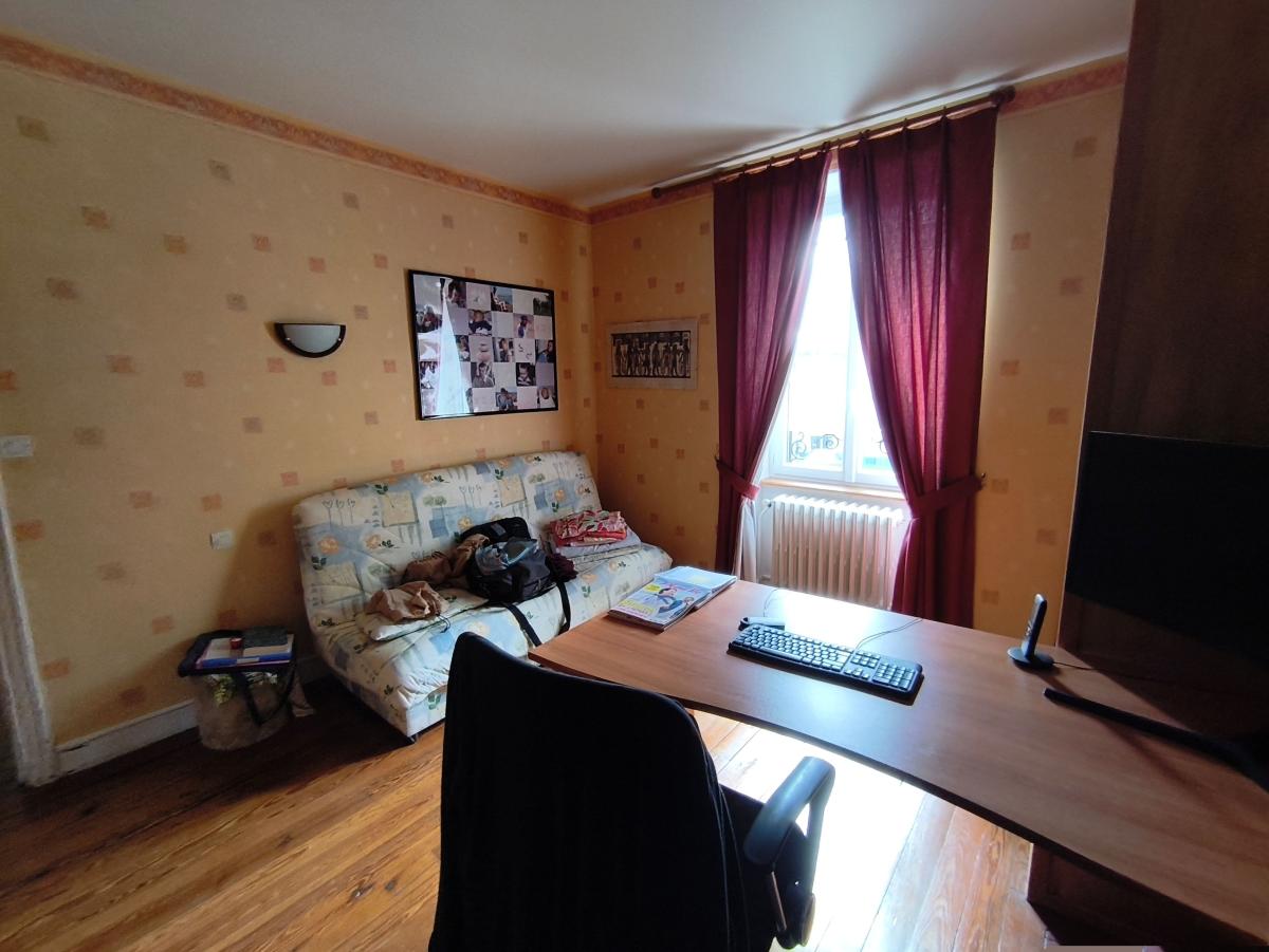 A proximité du bourg, maison de maître de 9 pièces principales, avec garage sur un terrain de 3.500 m². Le rez-de-chaussée est composée d'une entrée, un séjour-salon de 43 m², une cuisine aménagée, une arrière cuisine, une chambre et cabinet de toilette. Au 1er étage : palier desservant 5 chambres, un bureau, une salle de bains et un wc. Au 2ème étage : une pièce et une chambre. Cave en sous-sol. Garage 2 emplacements et appentis en dépendance. L'ensemble sur un terrain de 3.500 m² (cour, verger). Chauffage central fioul. DPE : D.