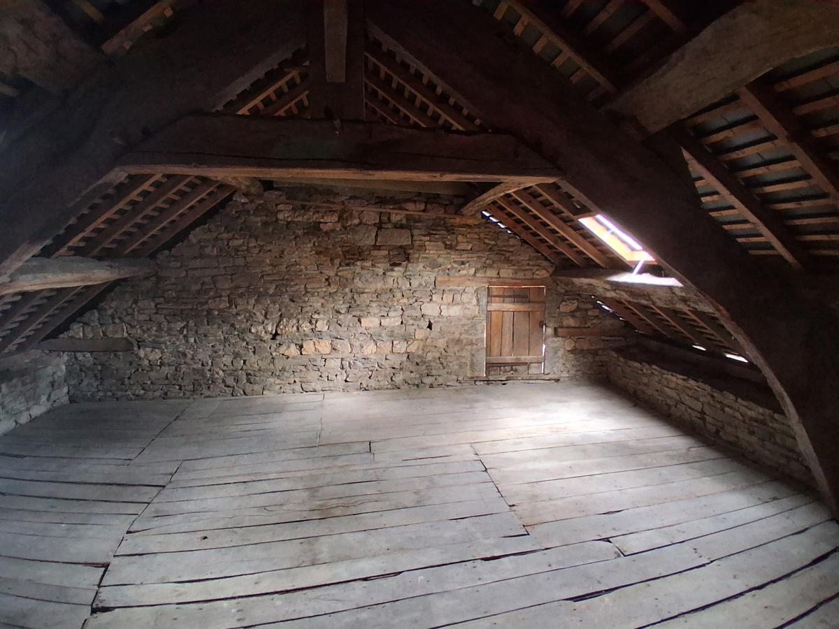 Maison mitoyenne dans bourg avec commerces et écoles comprenant : cuisine - salle à manger (cheminée) - salle d'eau avec WC ; Etage : 2 chambres en enfilade. Grenier aménageable au dessus. Cave. Garage. Chauffage central fuel. Cour et jardin. L'ensemble pour 3a 18ca.