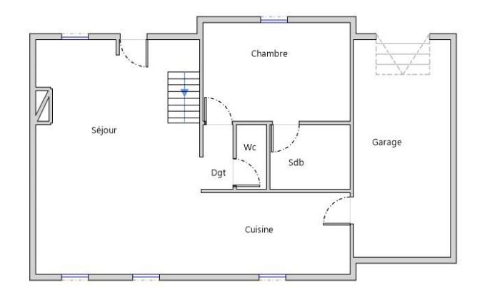 Au rez-de-chaussée : un séjour avec insert, cuisine, une chambre avec salle de bains et un WC séparés.